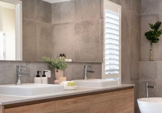 This ensuite uses soft grey and marble to create a warming and relaxing feel. The underlit wall hung vanity furthers this warmth, with circular basins that catch the eye and maximise storage in the cabinets below. Hiding the toilet pan behind the vanity is another great trick to create an attractive space.