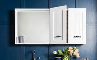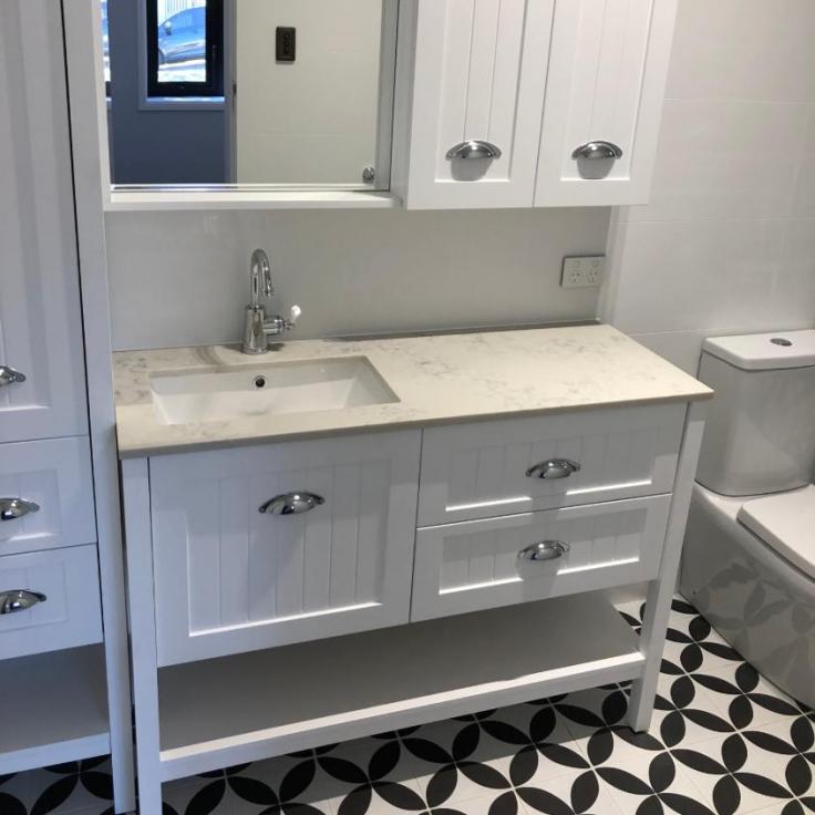 Traditional-style cabinetry and vanity are accented by semi-circular chrome handles and rounded mixer tap.