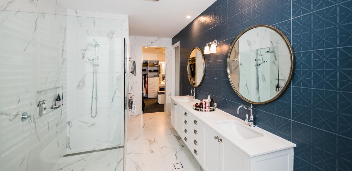 This ensuite really takes things to regal level. A rich royal blue feature wall with textured tiles perfectly offsets the marble flooring.