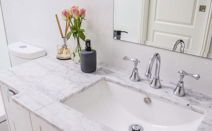 This main bathroom showcases a primarily traditional design, with some modern functionality. The combination of an all white palette, marble vanity top, subway tiling and ornate tapware is a celebration of traditional beauty.