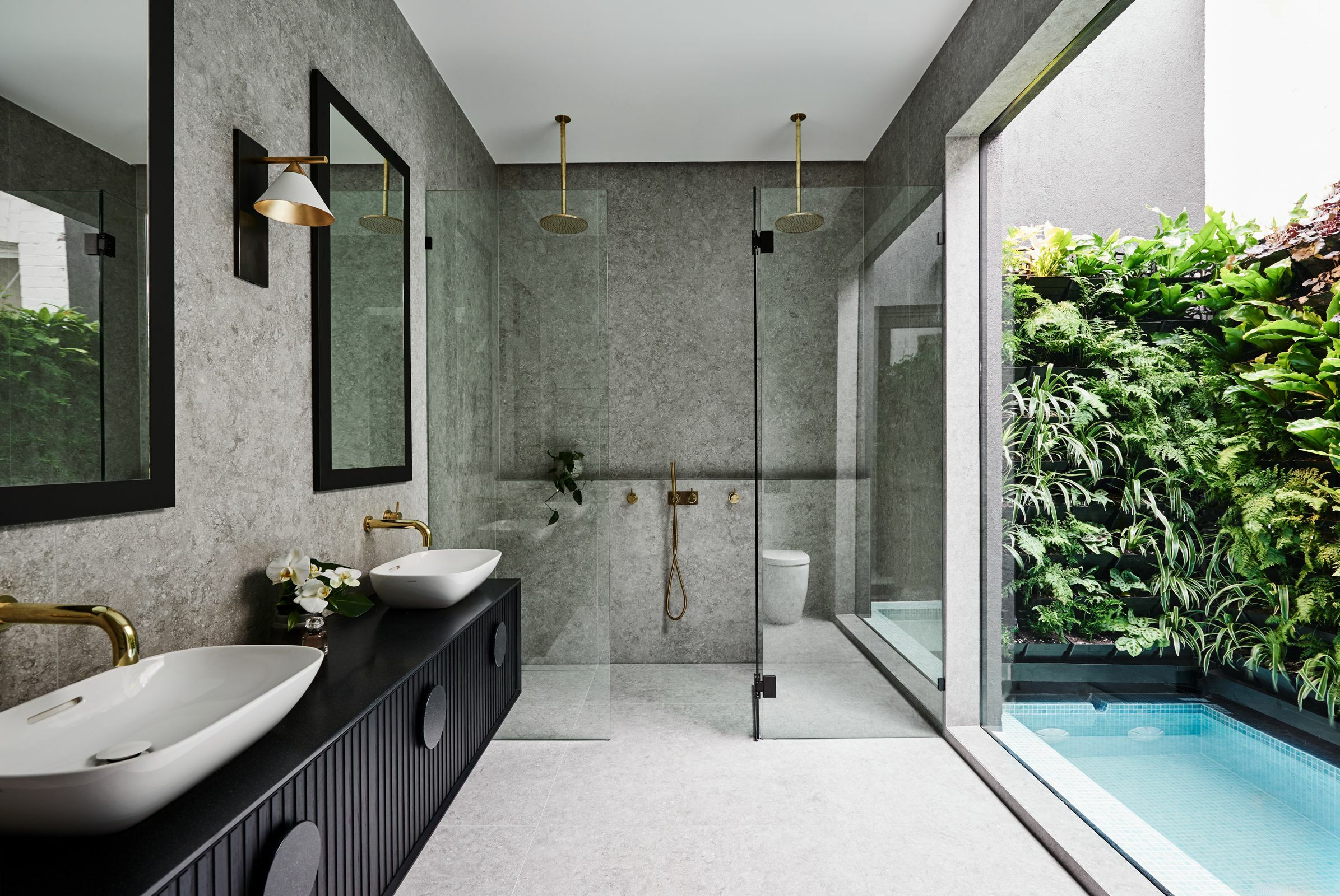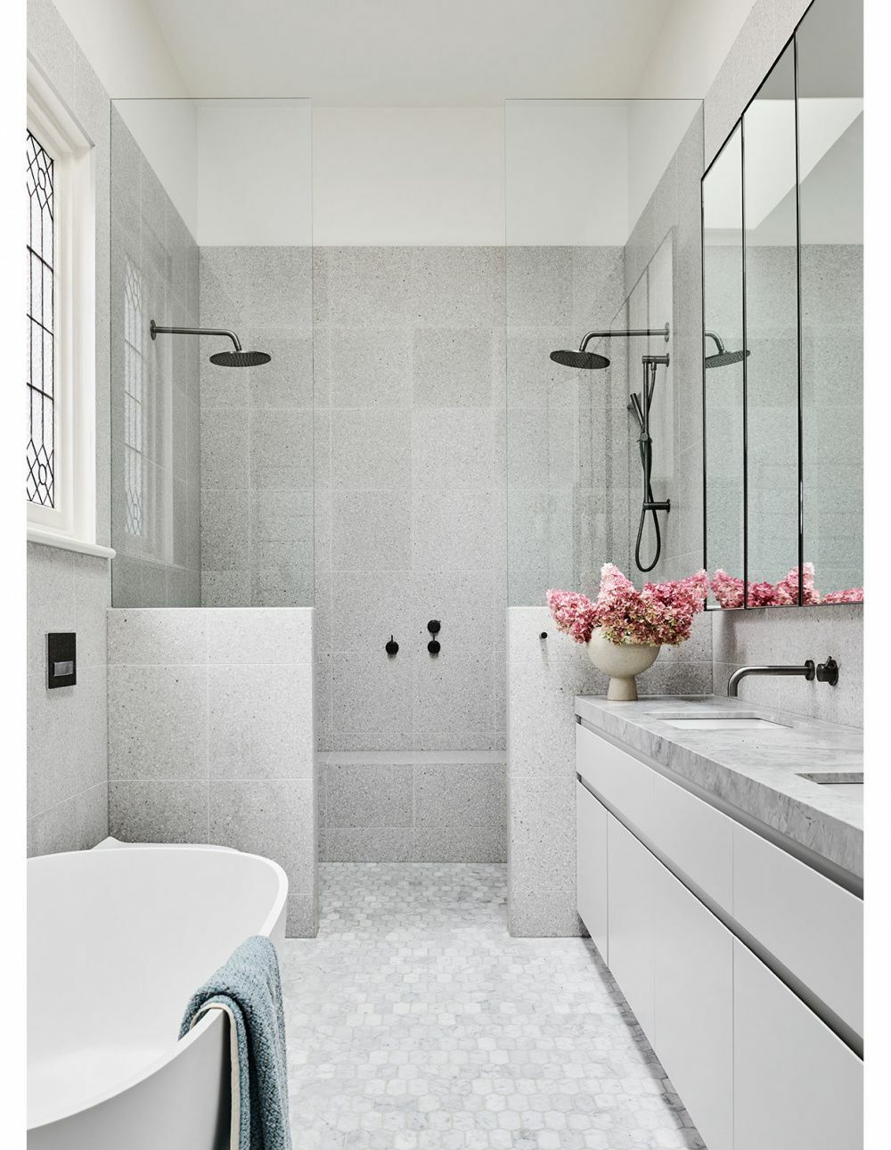 Former The Block contestants and talented design duo, Alisa and Lysandra incorporated not only a stunning twin shower, featuring two overheads and a hand shower for ultimate functionality, but included a luxe bath and striking double vanity in their Albert Park ensuite.
