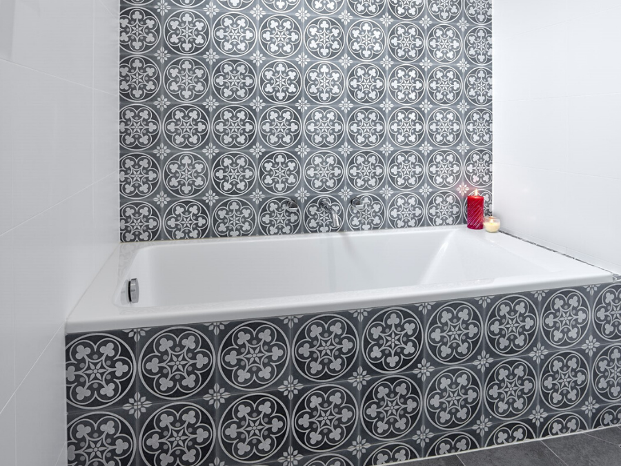 Growing in popularity in smaller bathrooms is the addition of a wet zone; a distinct area for the shower and bath, discretely positioned behind a shower screen. It may be hard to tell at first glance in this ensuite in SA’s Thebarton, but the intelligent design includes a wet zone with a screen just after the vanity, allowing for a bath and shower in the one space with geometric tiling elongating the bathroom.