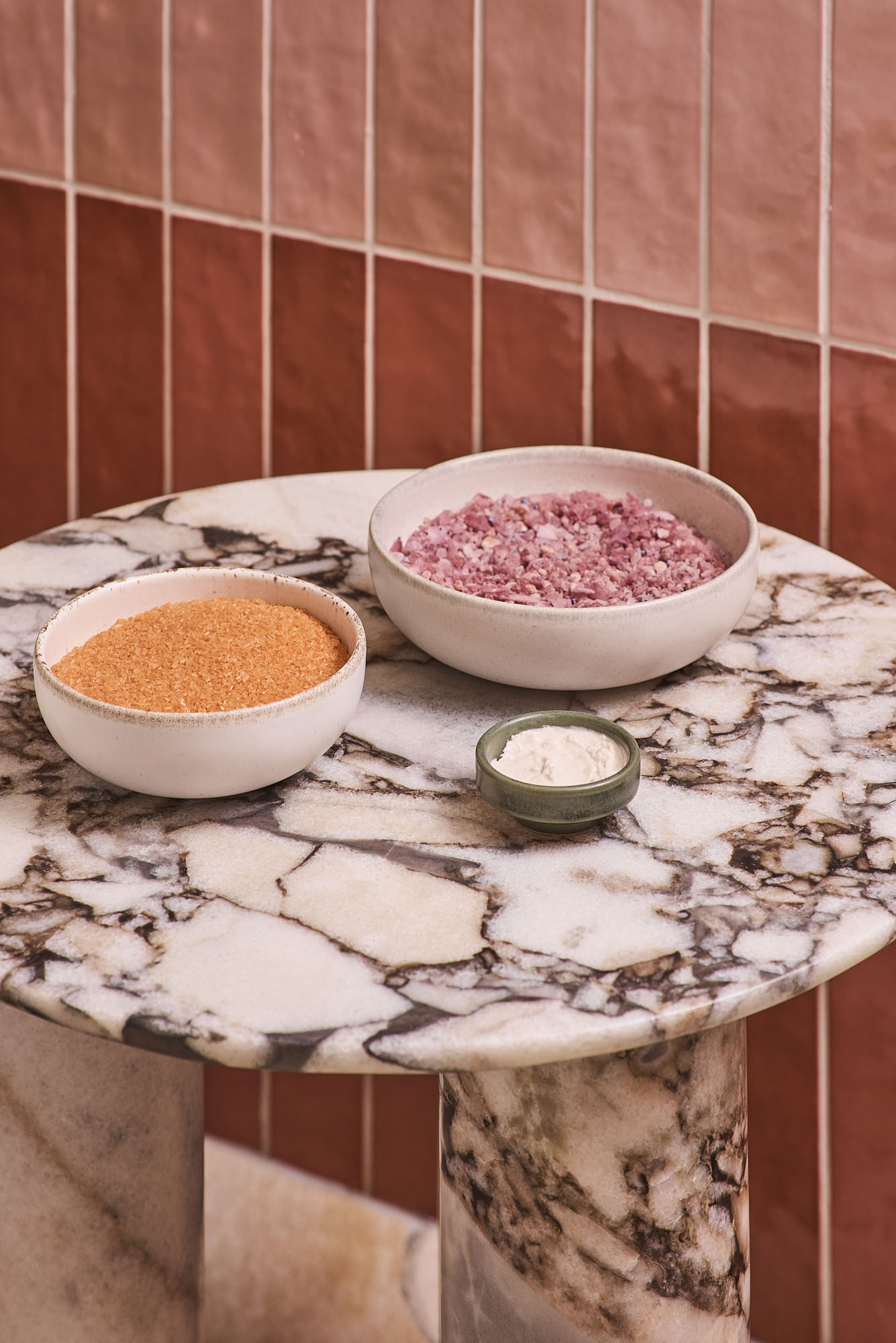 Nature isn’t just a backdrop, it’s a key ingredient. “Our architectural design brings the outside in, with therapy rooms that overlook a gently flowing stream,” Ferri explains. “We like to say we have a direct line to Mother Earth”. The shape of the Omvivo Villa baths and the texture of the Milli Etch tapware and Floor mounted bath outlet that were used in the spaces play a significant role in enabling that ever-important sense of calm and connection to wellness. Each team leant into the soothing, shapes and textures of the Omvivo Baths and Milli Etch tapware, with this combination appearing on all five spaces. Depth and mood was adjusted through the selection of differing colours; Sonny and Alicia’s winning space featured a the Omvivo Villa bath in Cove Grey, offset by Milli Etch Mixer and Outlet Brushed Gunmetal.