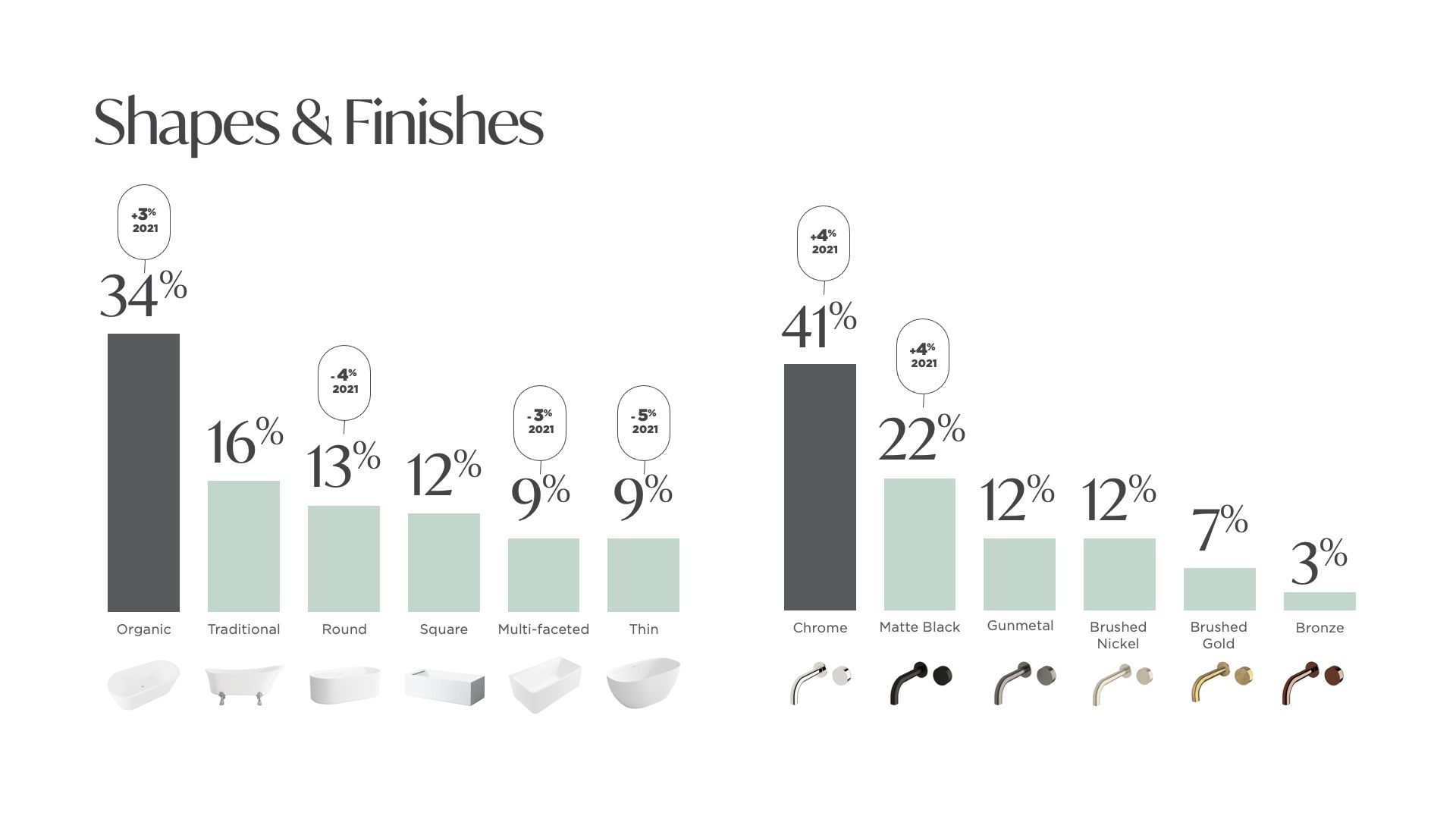 The Bathroom Report delved into consumer preferences across various bathroom products. Notably, respondents displayed specific preferences when it came to the shapes and finishes of essential items like baths and tapware. This finding suggests that aesthetics play a vital role in consumers' choices, with organic shapes being the hero style. Whilst chrome has been the long-standing favourite, each year we see matte black growing in popularity and an increase of Aussies looking for a range of colour finishes.