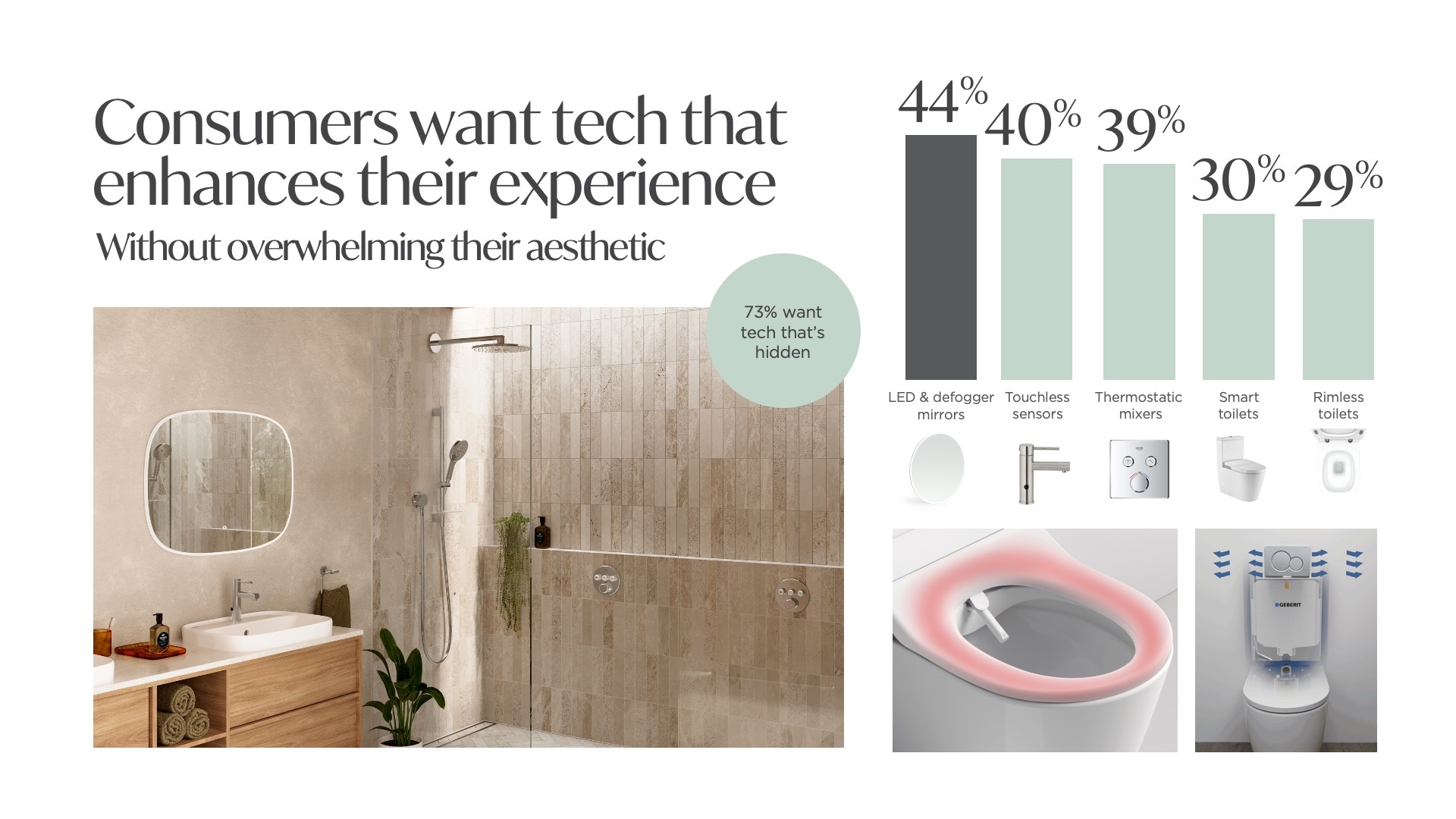 Furthermore, we found that bathrooms now rank among the top three most crucial rooms in a home in terms of property appeal. This finding underscores the growing significance of bathrooms as a determining factor in overall home value and attractiveness. With consumers favourite way to make a statement by having the bath and shower as their bathroom centerpieces, leaning into the growing trend of the bathroom being the self-care hub of the home.