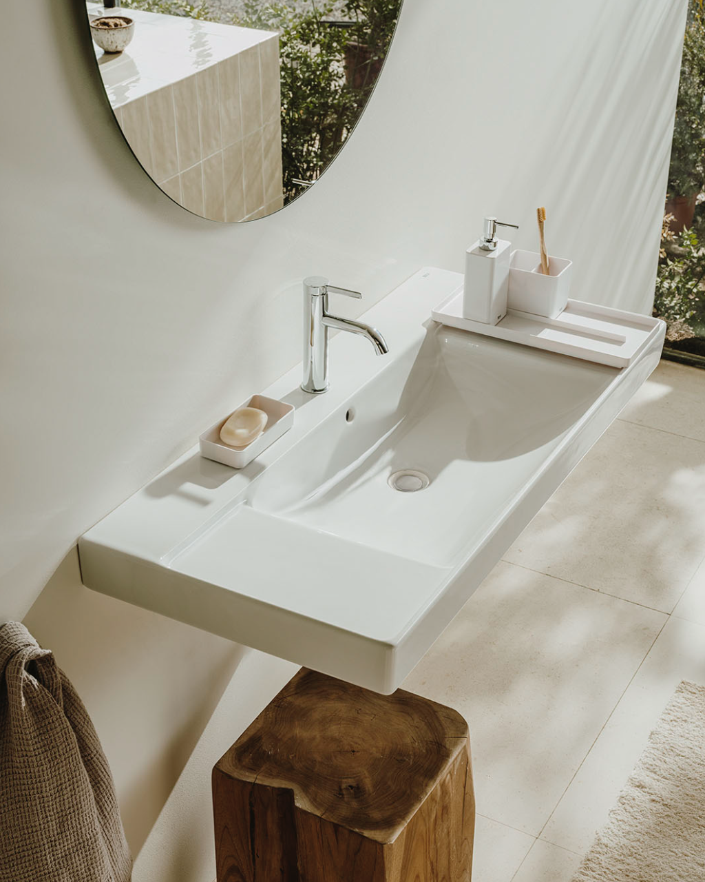 Ona, the Catalan word for ‘wave’, evokes tranquillity in the bathroom. The rounded corners and organic shapes of the ceramics reflect the smooth waves of the ocean, and the design touches your skin as lightly as a summer’s breeze.