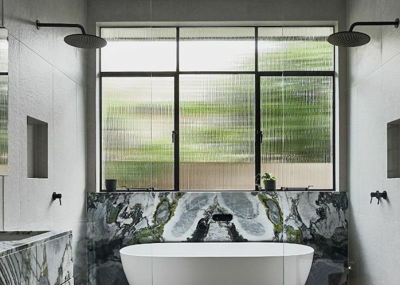 Note the frameless glass that elegantly breaks up the wet zone, the freestanding Kado Lussi tub flanked by two rainforest showers, and, of course, the stunning marble wall and vanity, rippling with shades of grey, black and forest green. Even the windows have been given the royal treatment, turning a stock-standard fence view into a frosted emerald backdrop.