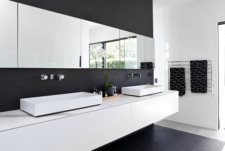 Recognised with two awards at the HIA Housing Awards, the master bathroom continues the monochrome theme established in the living spaces, with textured black floor tiling extended up the wall. An extensive floating vanity mirrors the floating effect of the house with its white concrete slab.
