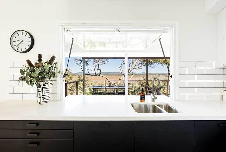 The renovated cottage is a breezy, light and modern beachside retreat. In the bathrooms: a refreshing mix of black, white, timber and coastal touches.