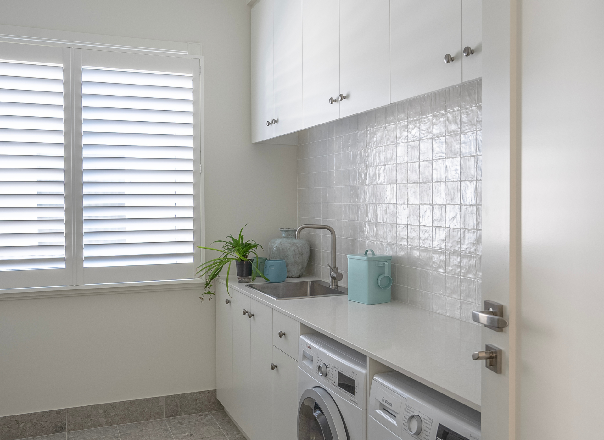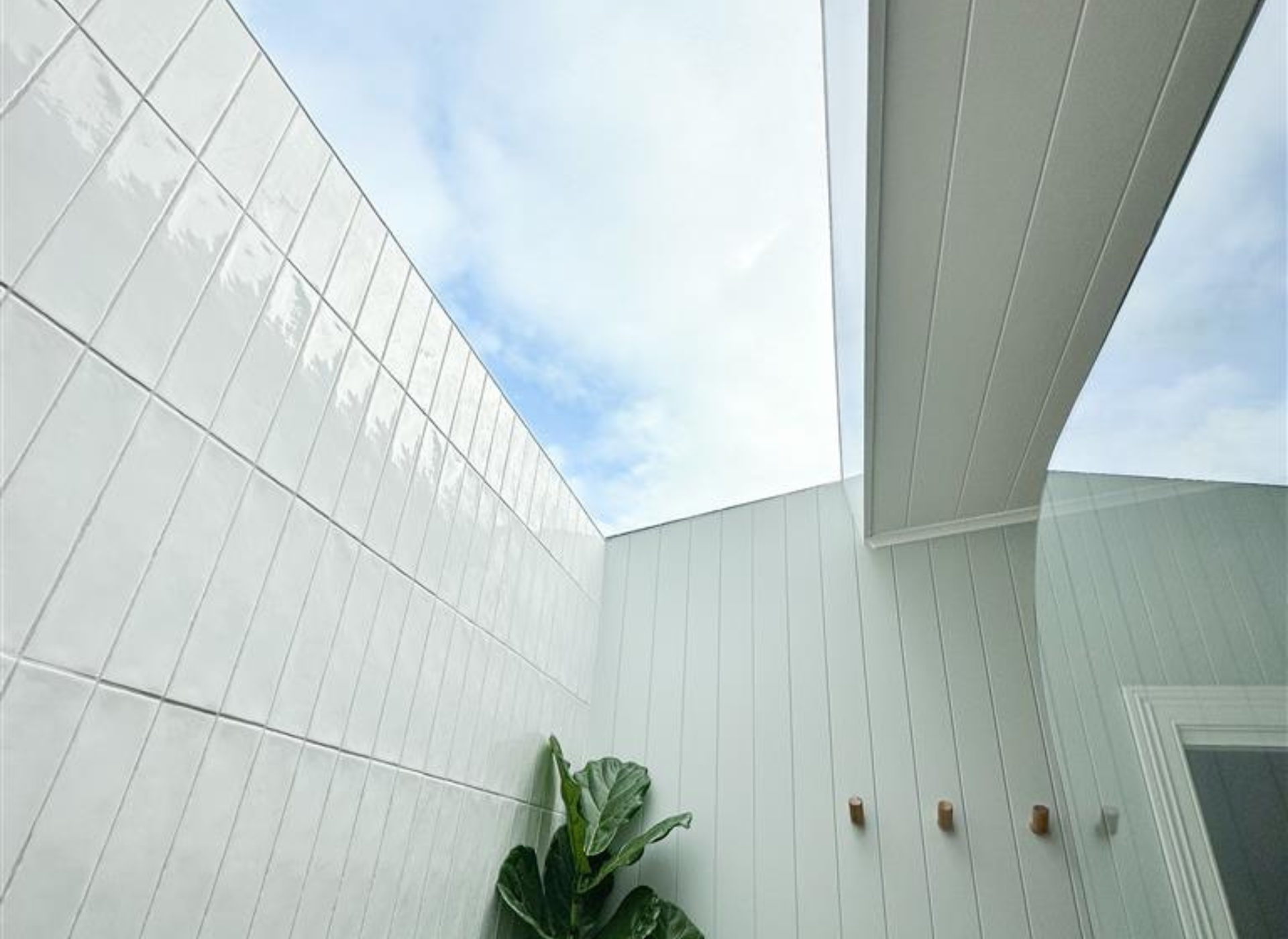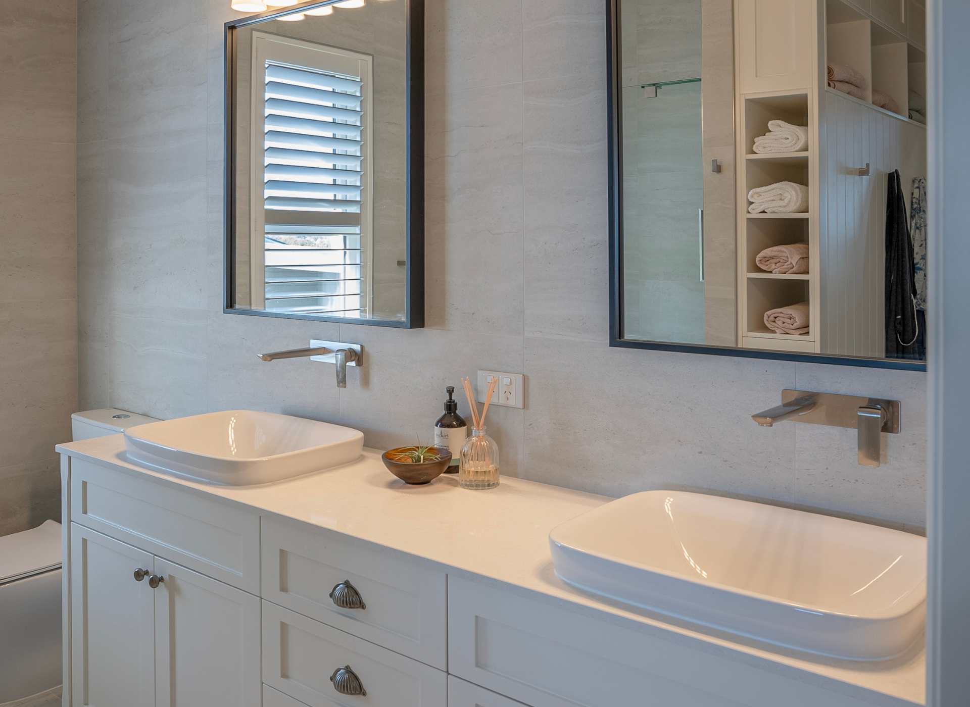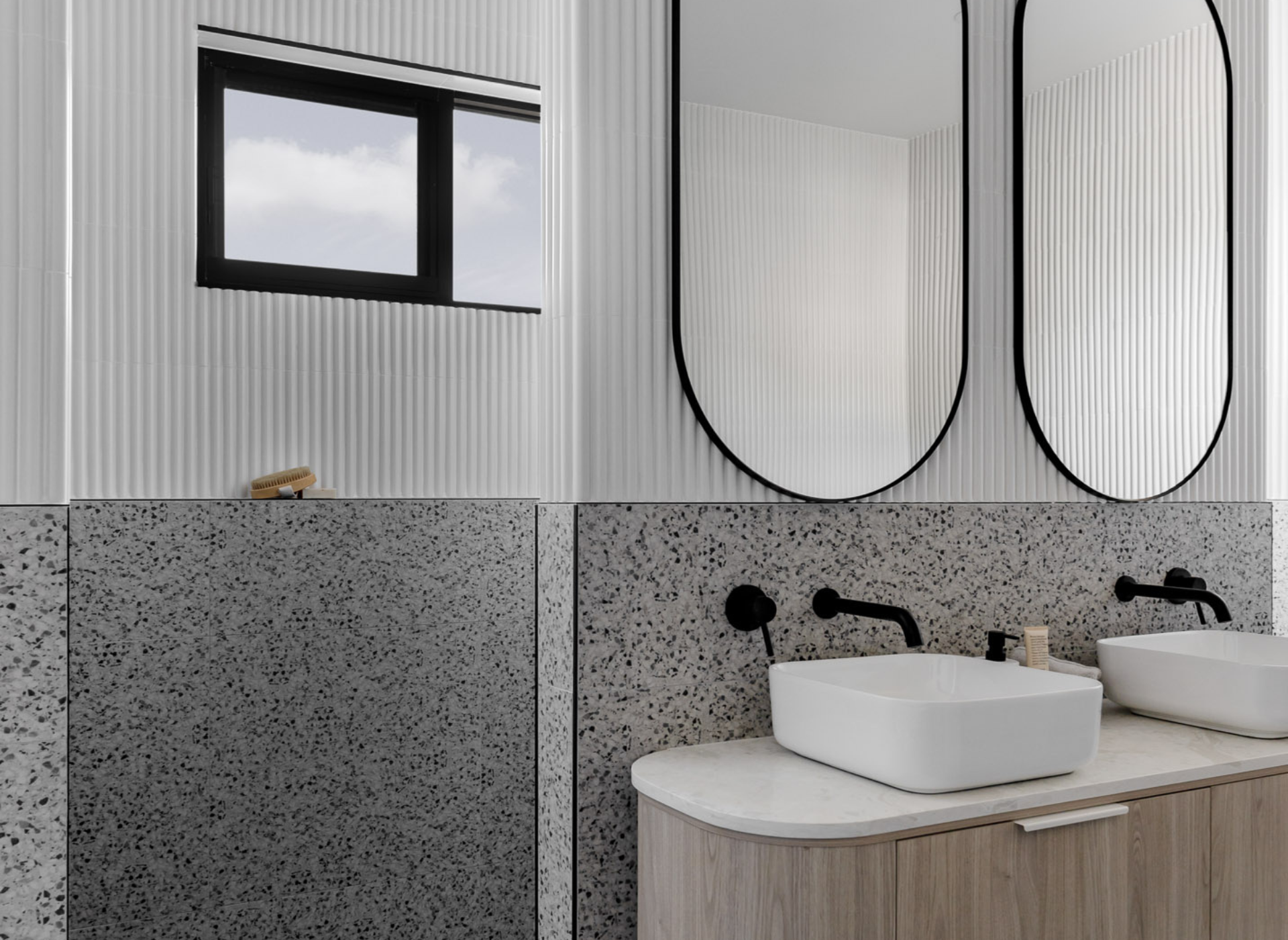 This award-winning bathroom proves that lightweight housing doesn't have to compromise on style. External cladding artfully evokes true Hamptons architecture, while natural light and impeccable colour choices create a harmonious ambiance.