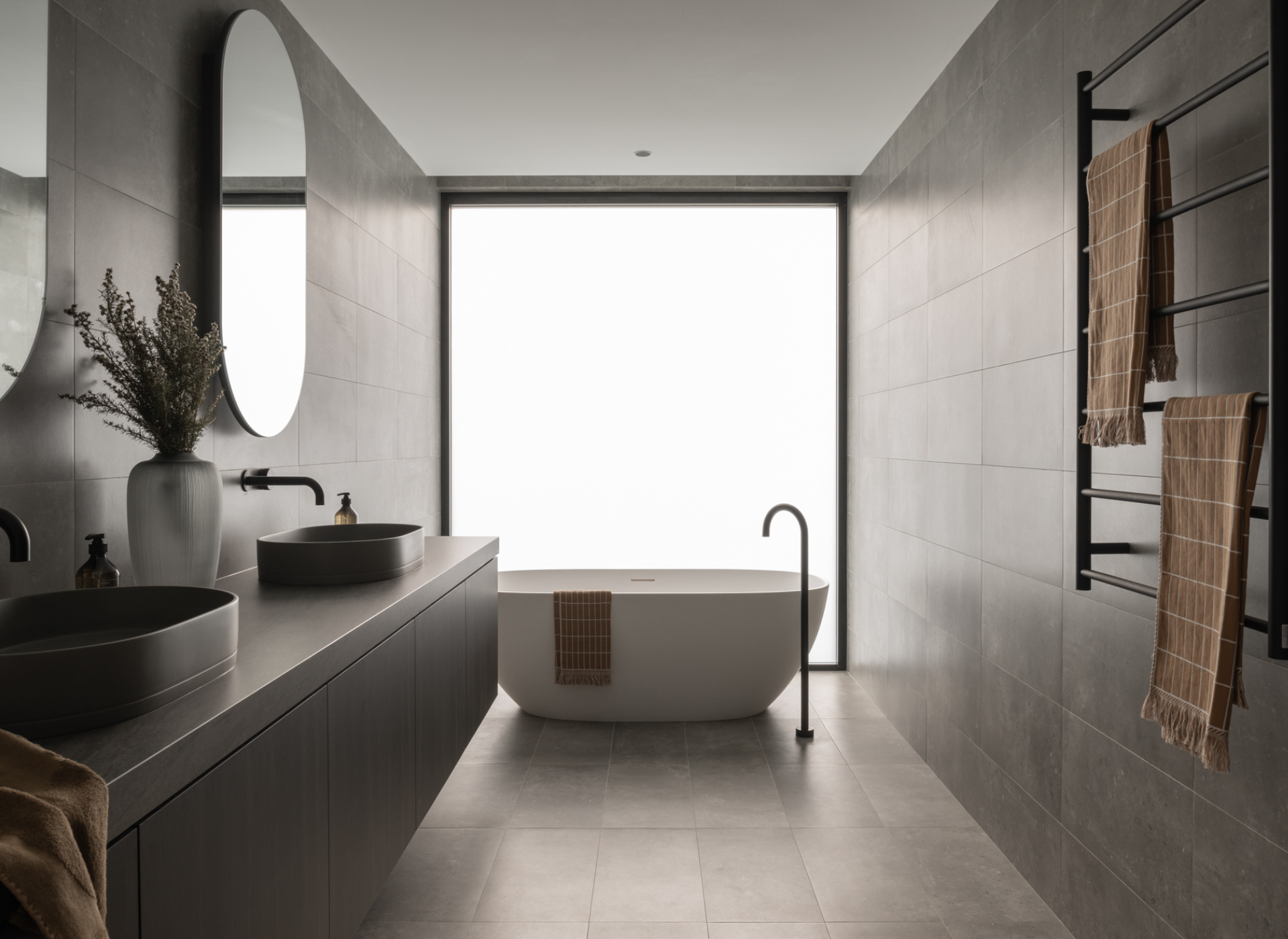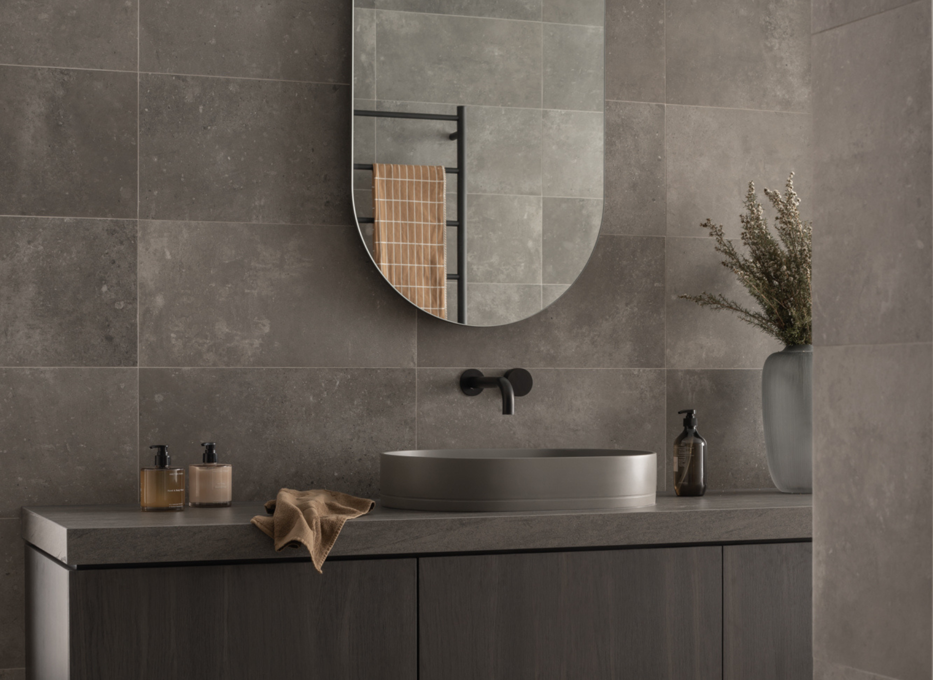 Mark King's vision goes beyond volume, transforming King Homes NSW into a premier mid-level custom builder. His expertise shines through in this award-winning bathroom, where dark timber, slate tiles, and a grey concrete basin blend seamlessly with the matte black textures of the Milli Pure and Mood collections for a modern, polished edge.