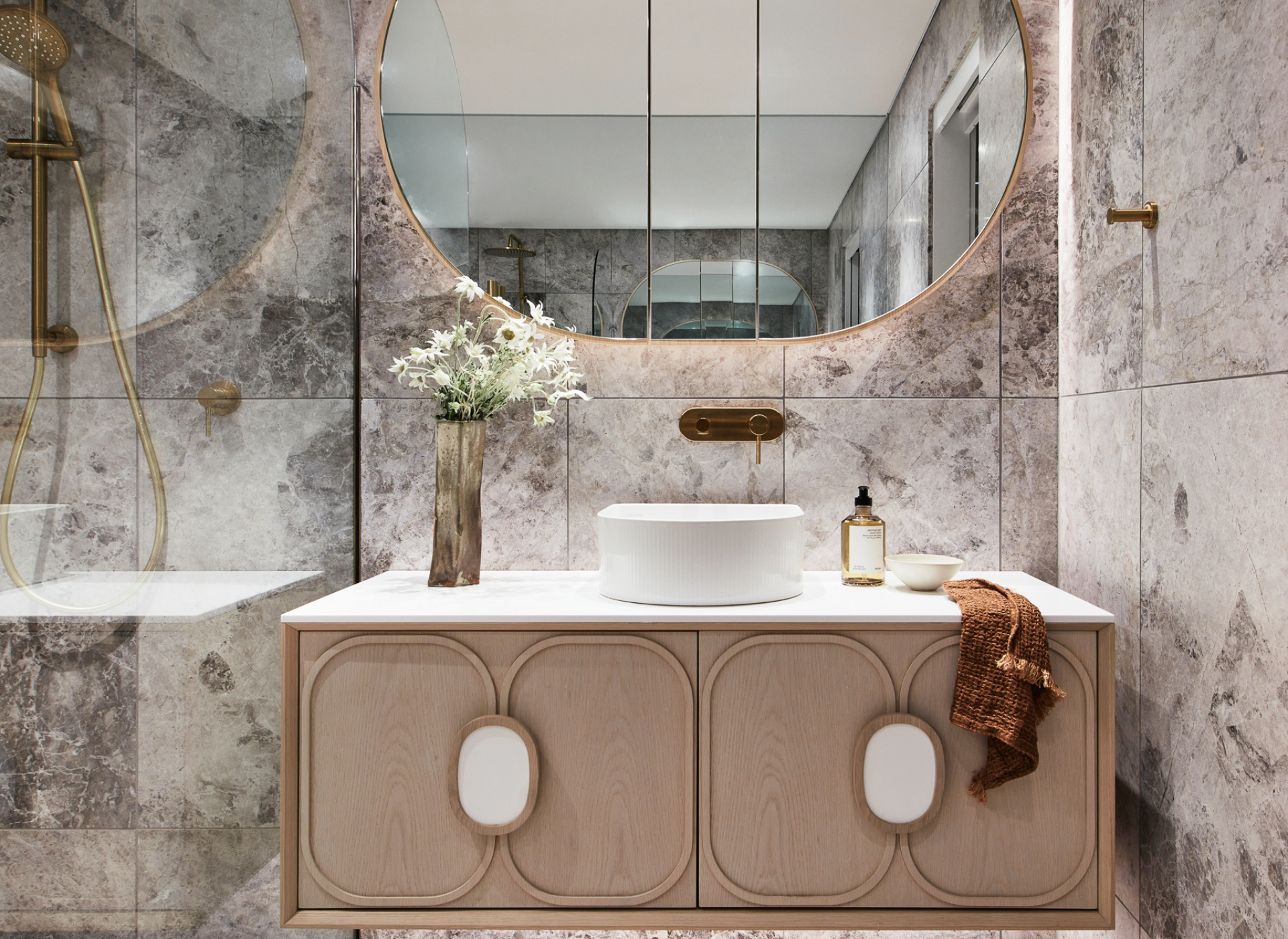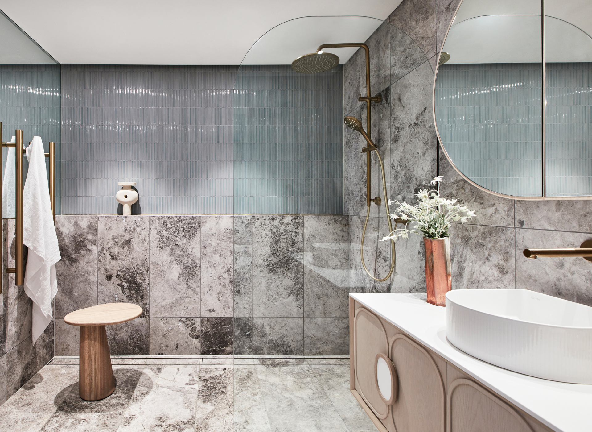 Bow down to the queen of curves! Catherine de Meur's award-winning bathroom is a dramatic ode to glamour, defying spatial limitations with clever lighting and oversized features. Brass accents add a touch of timeless elegance, while the use of matte materials amplifies the interplay of light and shadow working, with excellent tile and stone supplies from Sareen Stone.
