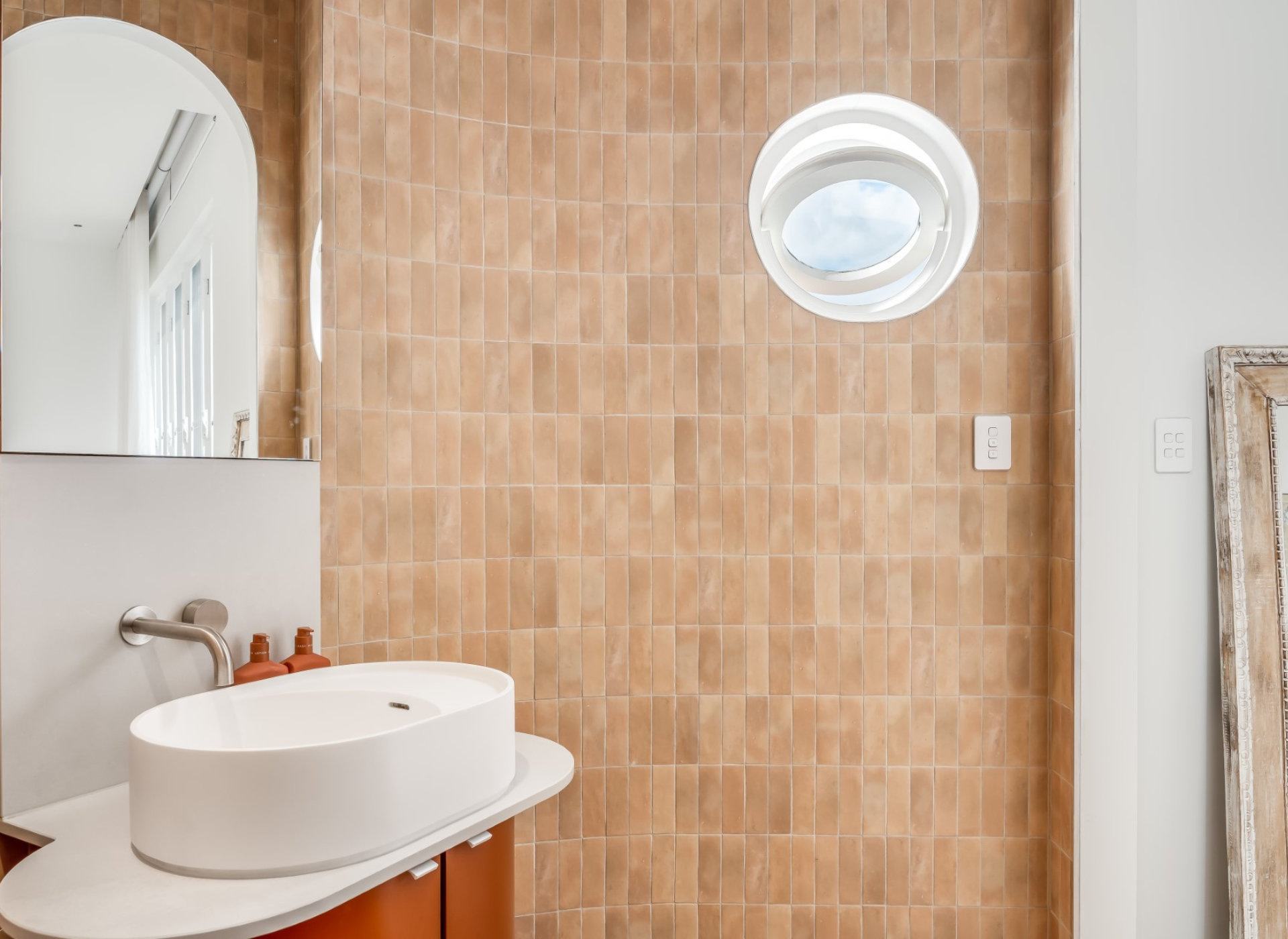 This coastal gem embraces its seaside location with open arms. Soft curves and a hint of mid-century flair dance hand-in-hand, creating a bathroom that's as refreshing as the ocean breeze itself.