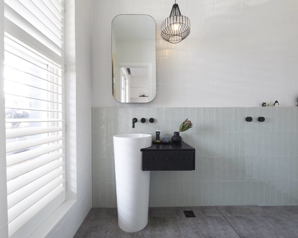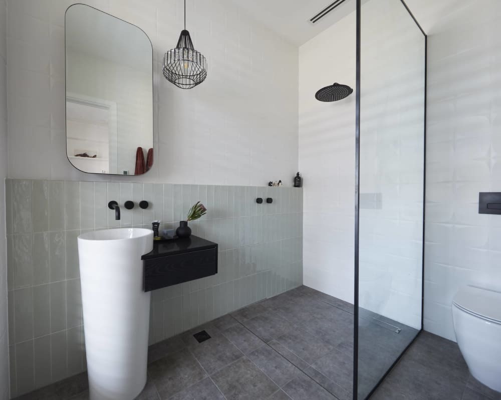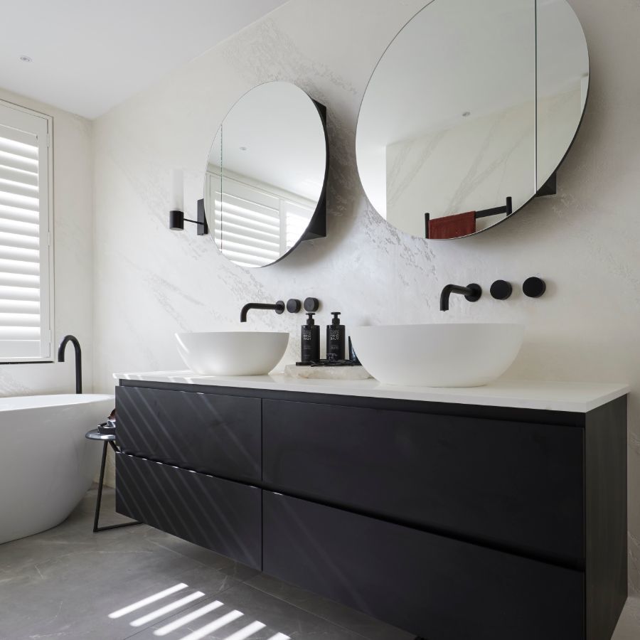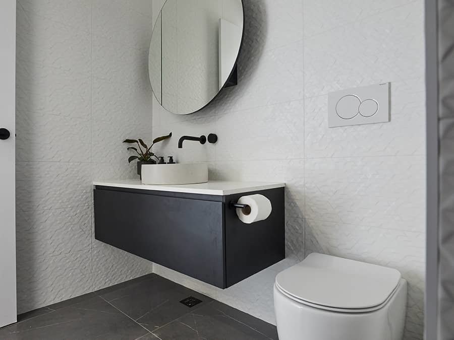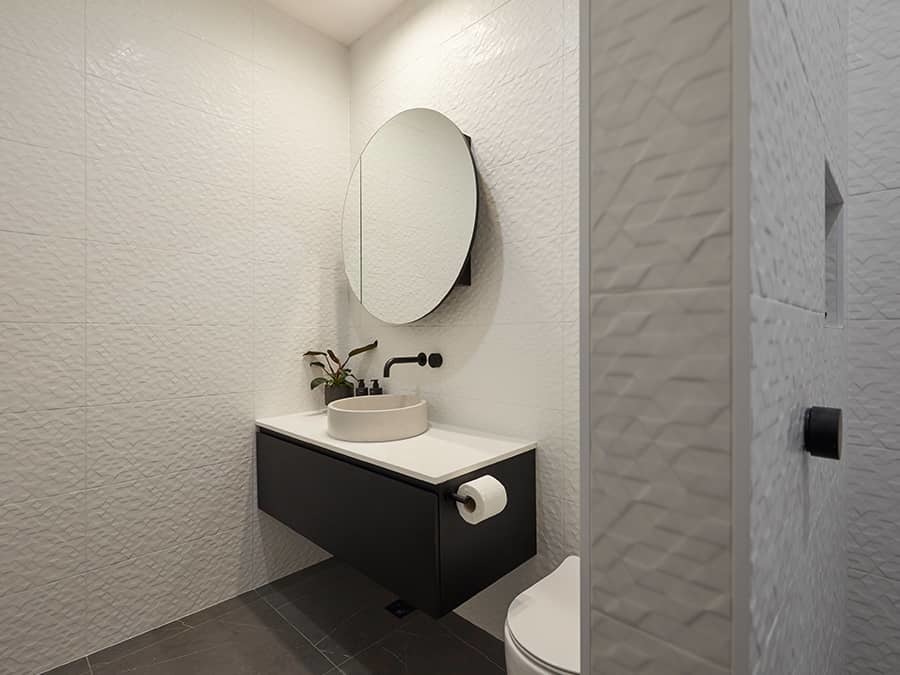 Elise and Matt have gone with textured white wall tiles and large grey floor tiles to make their space feel bigger. Their circular basin pairs perfectly with their round mirror and curved toilet in a cohesive look that produces a calming effect. It’s practical and stylish, with a wall separating the shower for privacy and a sleek vanity with ample storage.