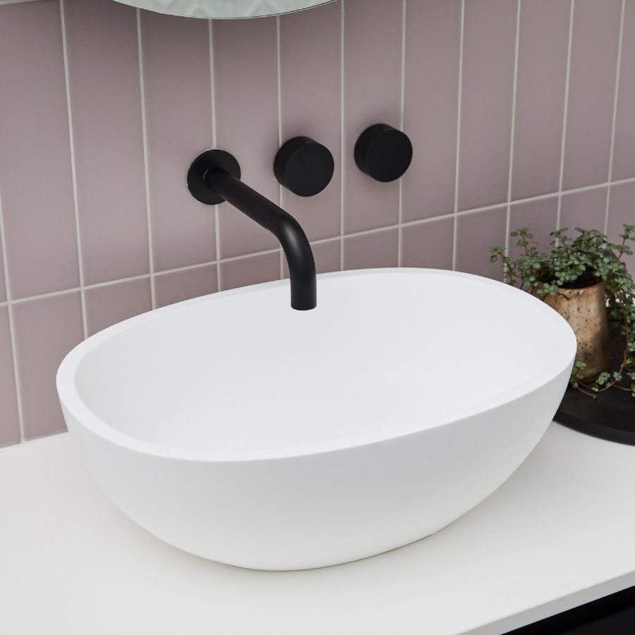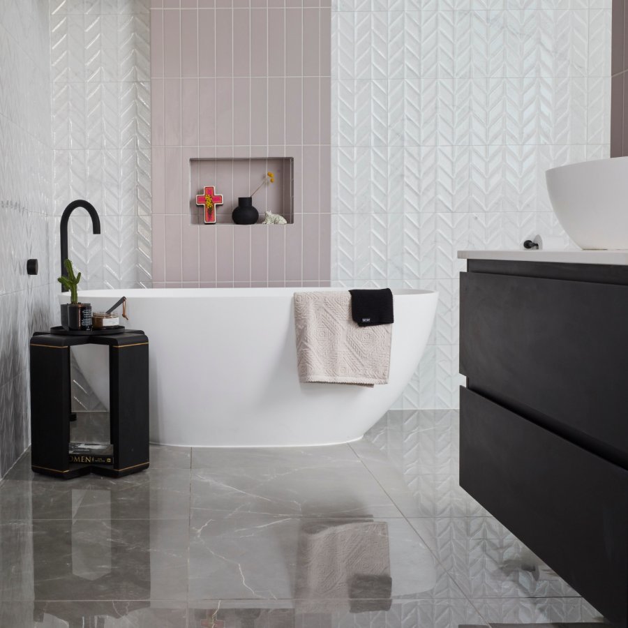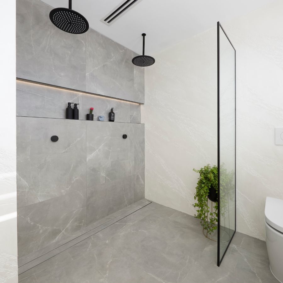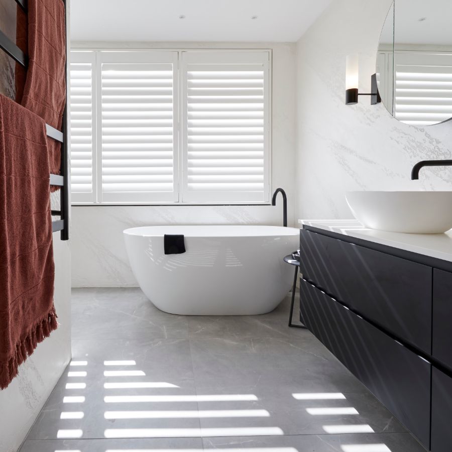 Elise & Matt’s main bathroom feels hotel inspired. The two vessel basins bring their sleek curves that stand out from the vertical tiles behind. The polished marble floor makes the freestanding bath seem to appear out of the ground. The floor outlet in matte black only adds to the effect, elegantly curving out over the bath. The matte black finish brings consistency to the room, matching the heated towel rail and the bath taps. This is one luxurious main bathroom.