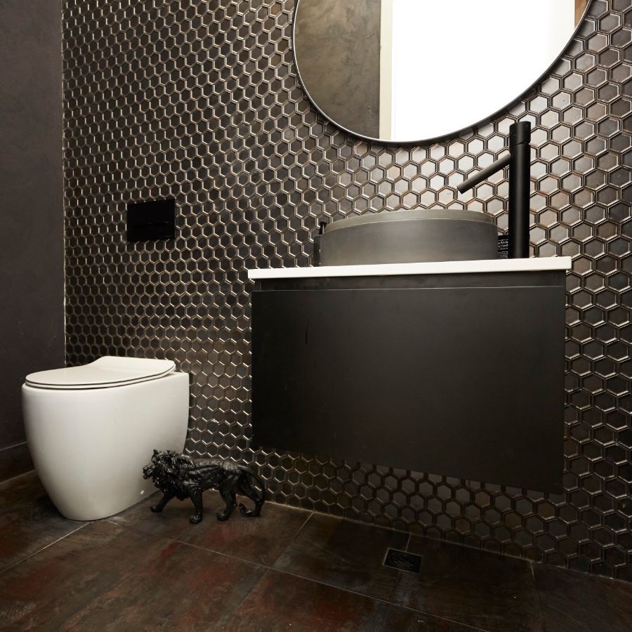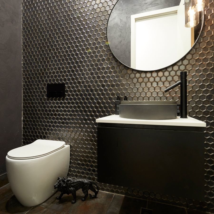 The most finished part of Elise and Matt’s house this week, this powder room is moody and contemporary. The back to wall toilet pan pops out from the metallic honeycomb tiles behind, and the matte black of the vanity opens up the space. The extended basin mixer contrasts with the white top of the vanity to create interest and intrigue.
