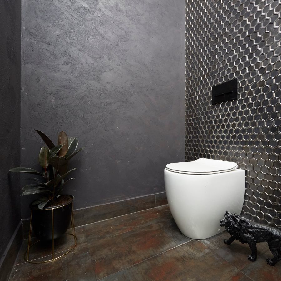Smart design decisions continue with the back to wall pan, concealing the cistern and increasing the feeling of space. Stylish matte black fittings create contrast in the walls.