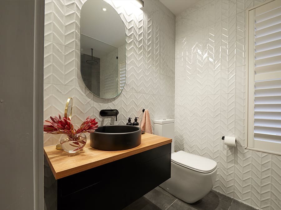 Tess & Luke’s guest ensuite is a celebration of the neo classic trend. The traditional-style wall hung vanity is topped by two modern bi-colour counter basins. The mirrored cabinet provides further storage solutions.