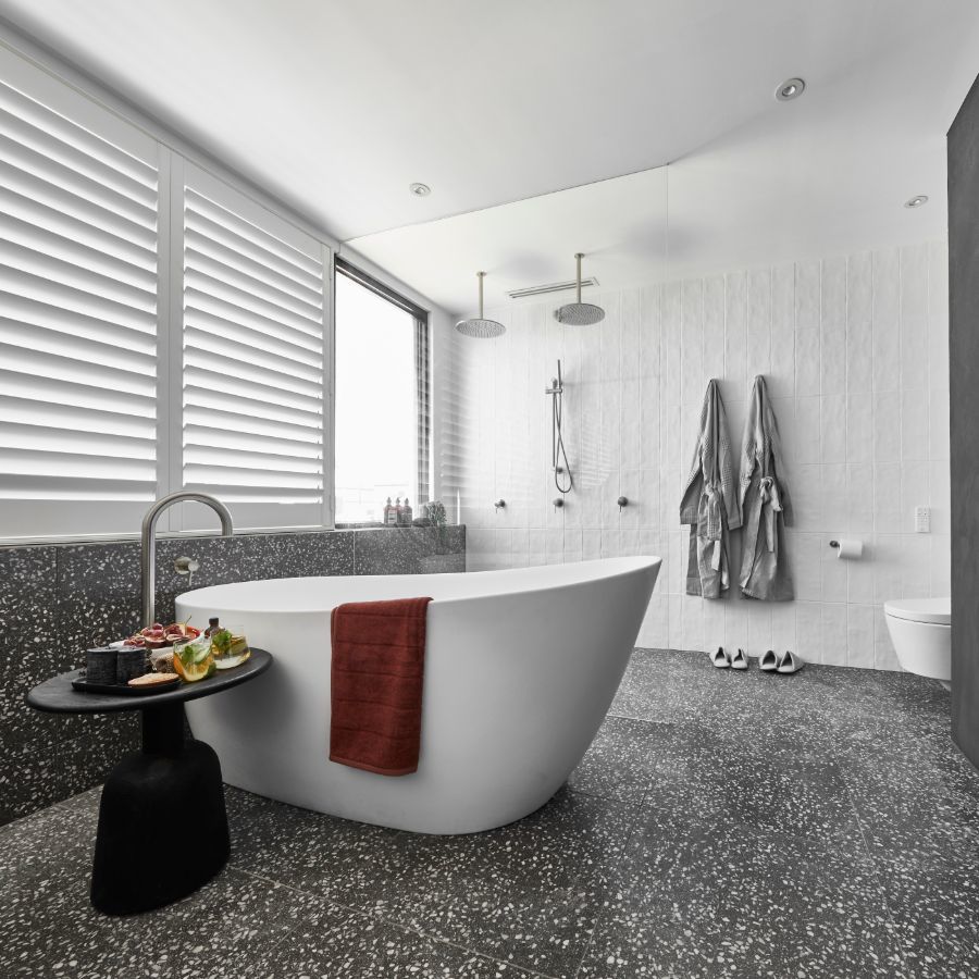 While the judges were also concerned by the shower’s clear, unfrosted window, they loved the ensuite overall. Neale thought that they’d use the terrazzo effectively and loved the shower tile choice as well. However, the judges were split on the feature wall. Shaynna loved the dramatic black that connected with the finish of the basins, but Neale and Darren thought it closed off the space.