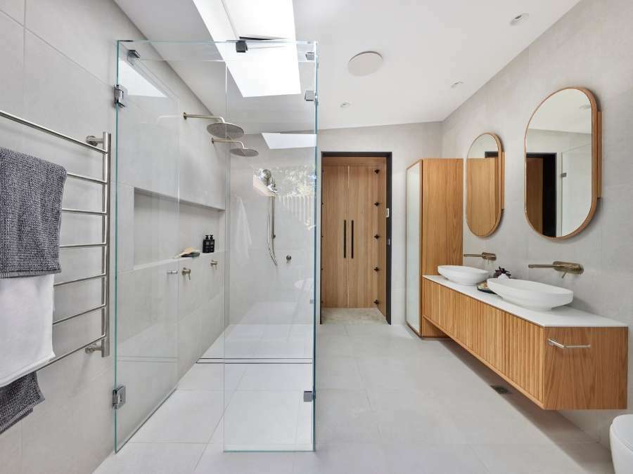 Luke & Josh kept their vanity choices consistent with their guest ensuite, including a beautiful timber ISSY Halo I vanity and two ISSY Blossom shaving cabinets, which they paired with the Z8 tallboy for extra storage. The twins cleverly connect the outdoors and inside by using the same floor tiles and their Omvivo Venice 500 solid surface basins, which connect the tactile bath and brushed nickel together for one cohesive space.