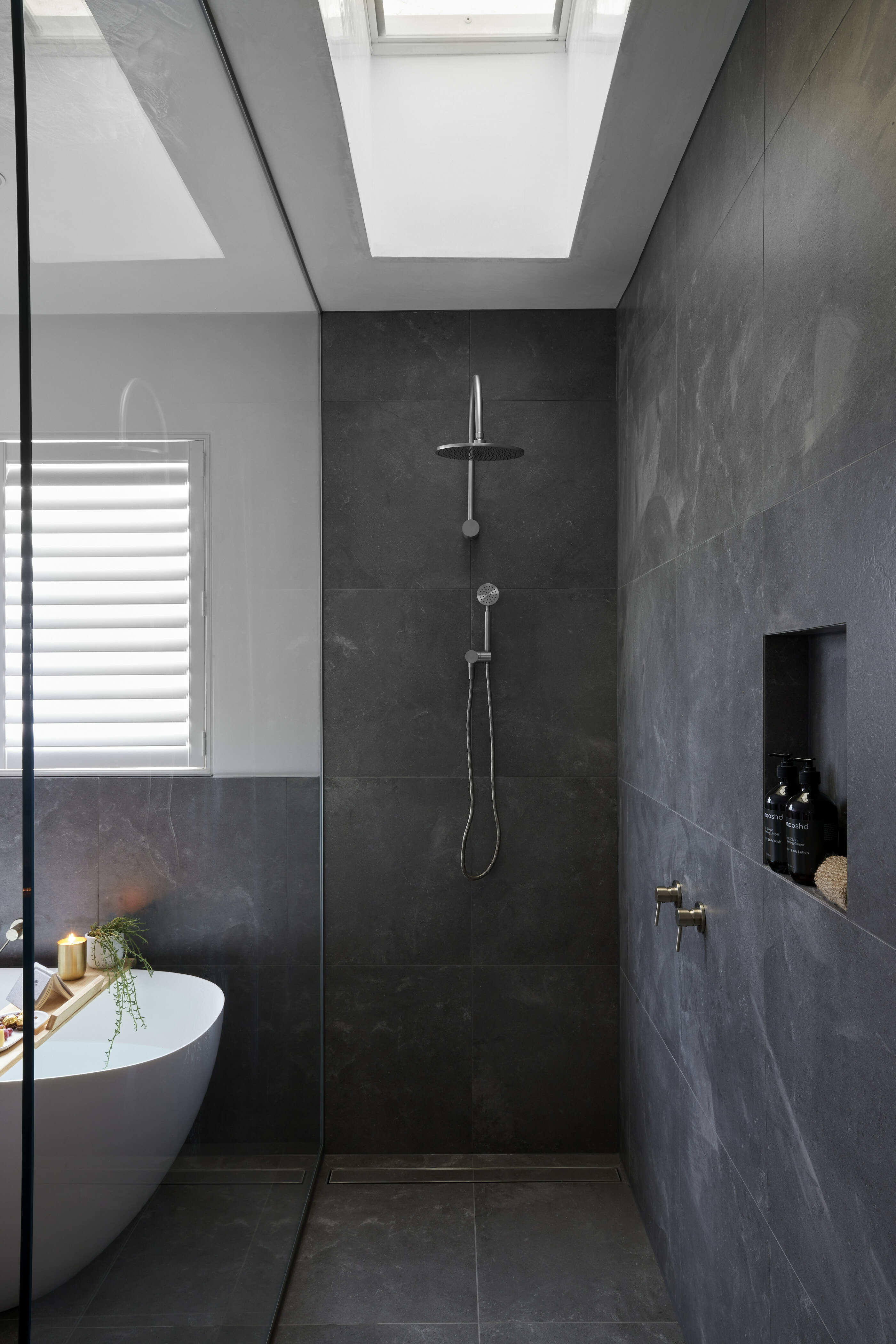 Toning down the drama, a skylight, window and expansive ISSY Halo timber double vanity add comfort and warmth. A Kado Lussi thin-edged freestanding bath is cleverly chosen to bring softness to the space, complemented with basins from the same range.