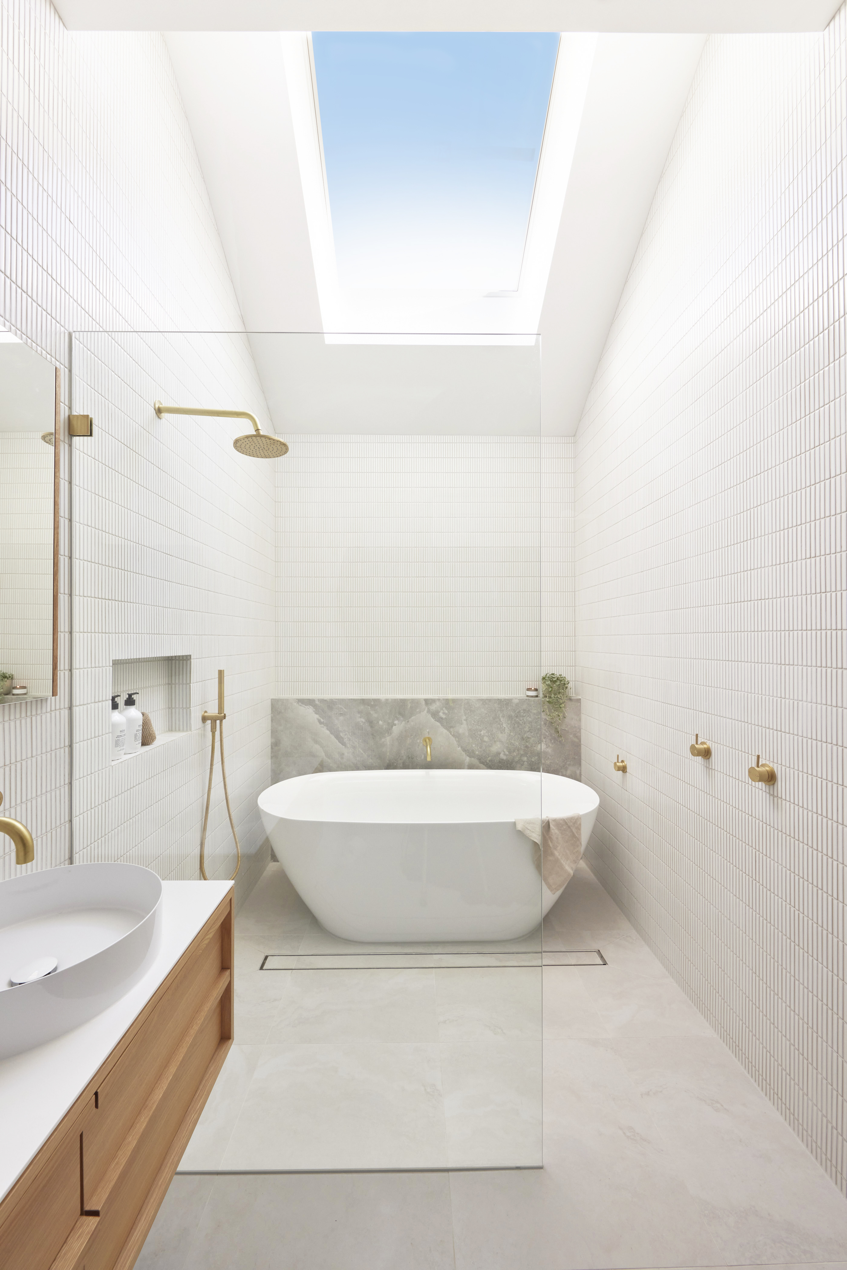 The couple have opted for an enormous skylight, which allows natural light to pour over the eye-catching Kado Lux oval freestanding bath. As bathrooms typically lack windows, skylights make for a great way to bring in light without compromising on privacy.