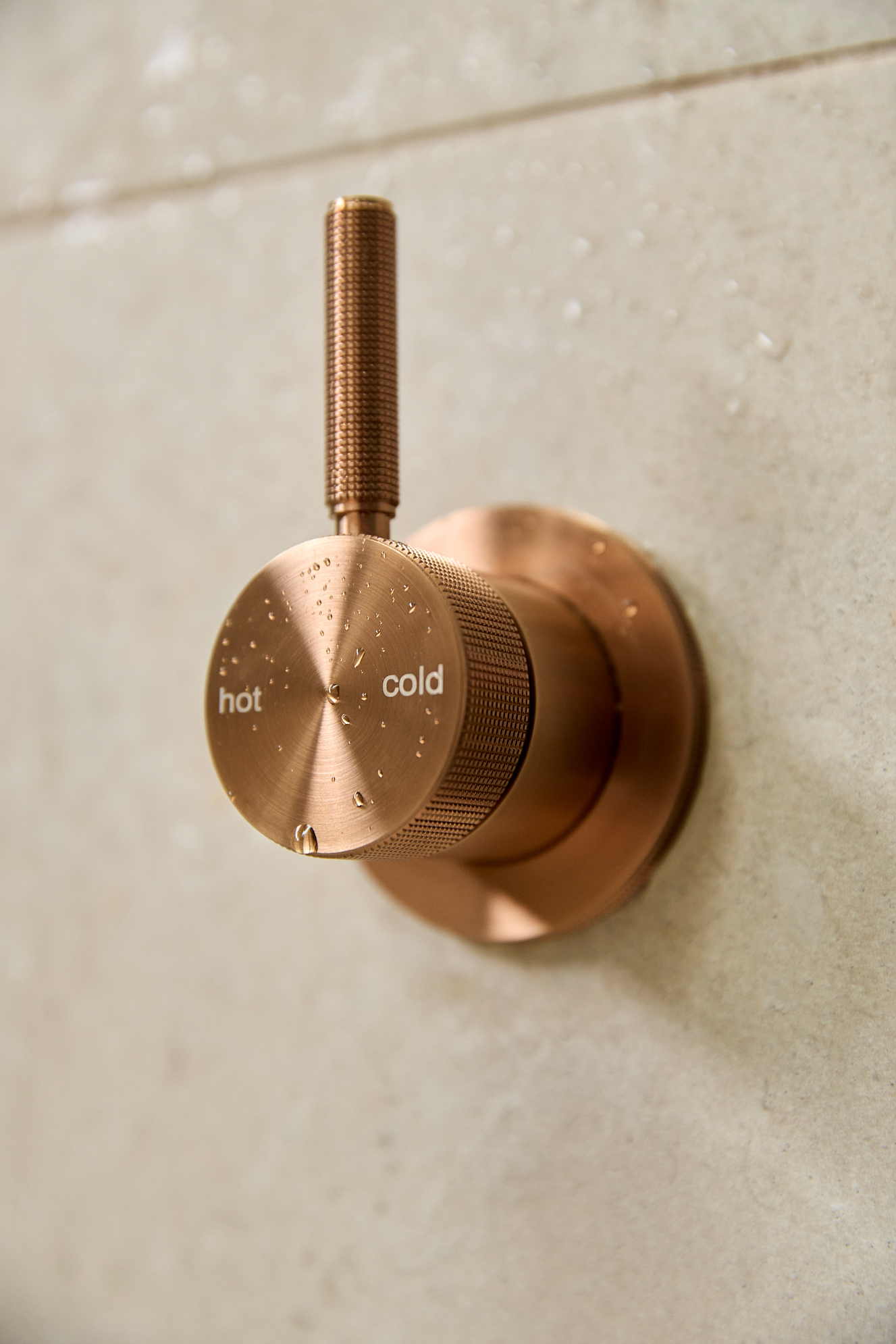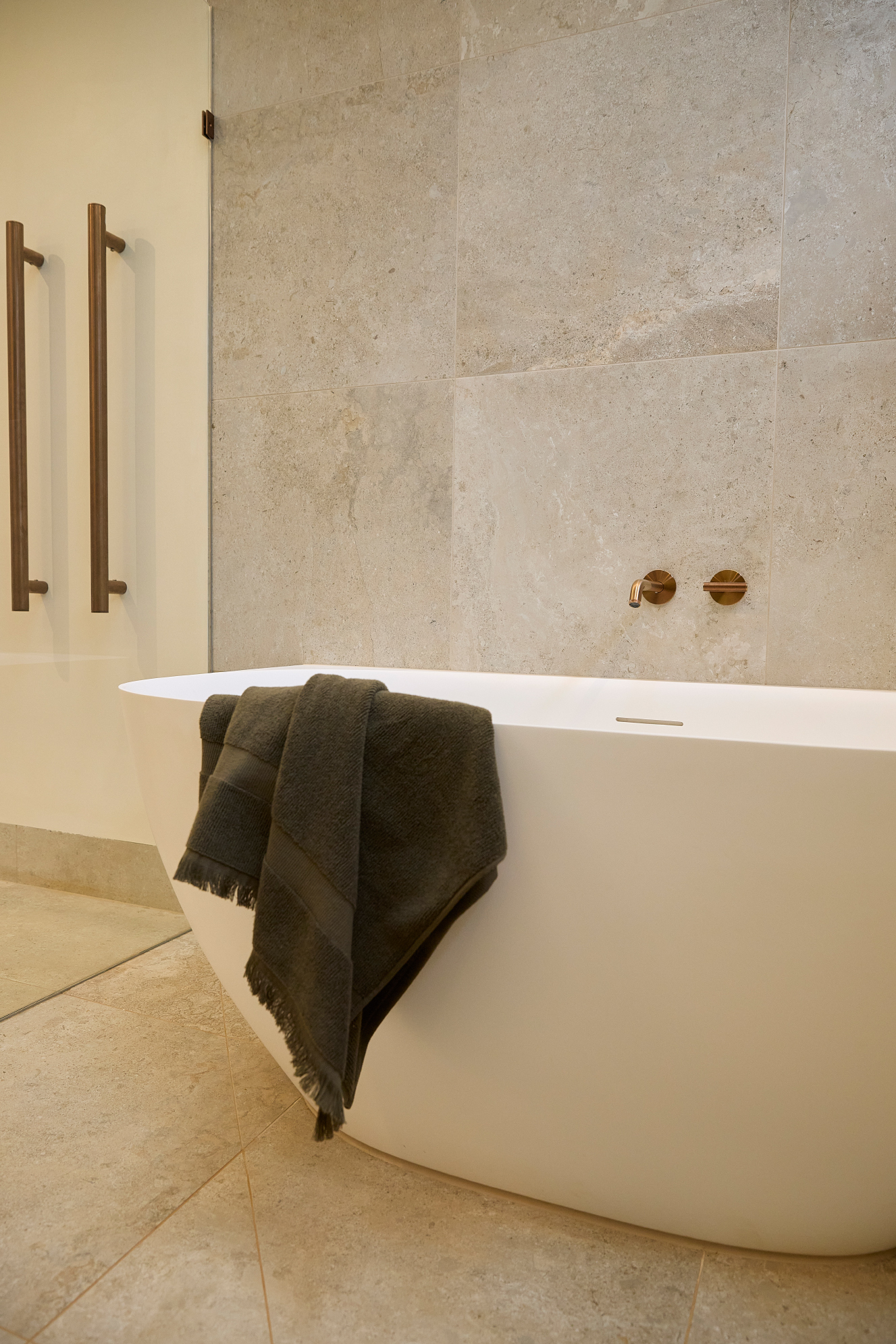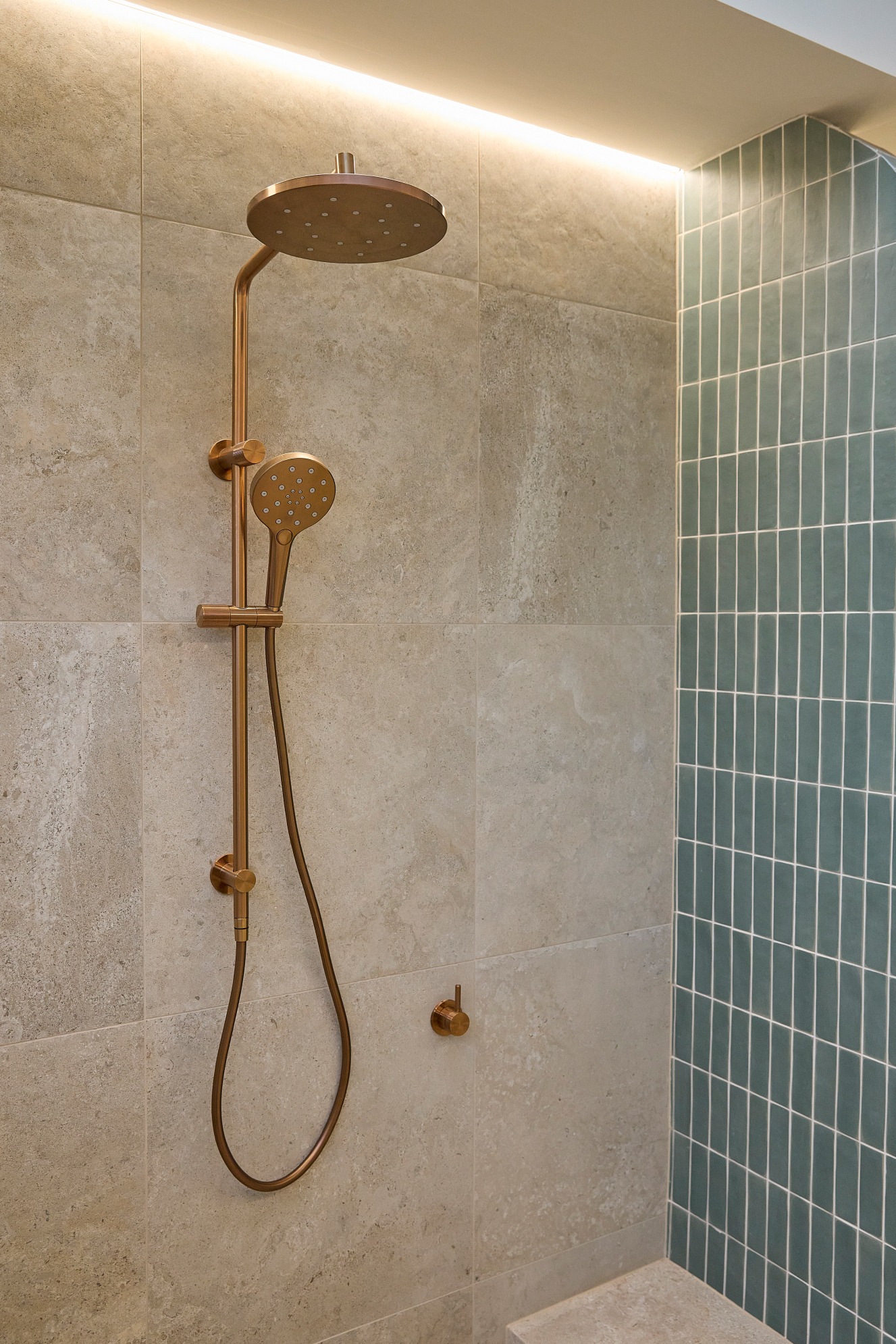 Brushed bronze finishes throughout the space add a modern contrast and cohesive elegance. The Milli Etch tapware’s warm metallic tone complements the green and timber palette perfectly, offering a striking yet balanced aesthetic. The brushed bronze Milli Mood Edit heated towel rail introduces a touch of practical luxury - ensuring a warm towel is always within reach, enhancing daily routines with a dose of comfort and indulgence.