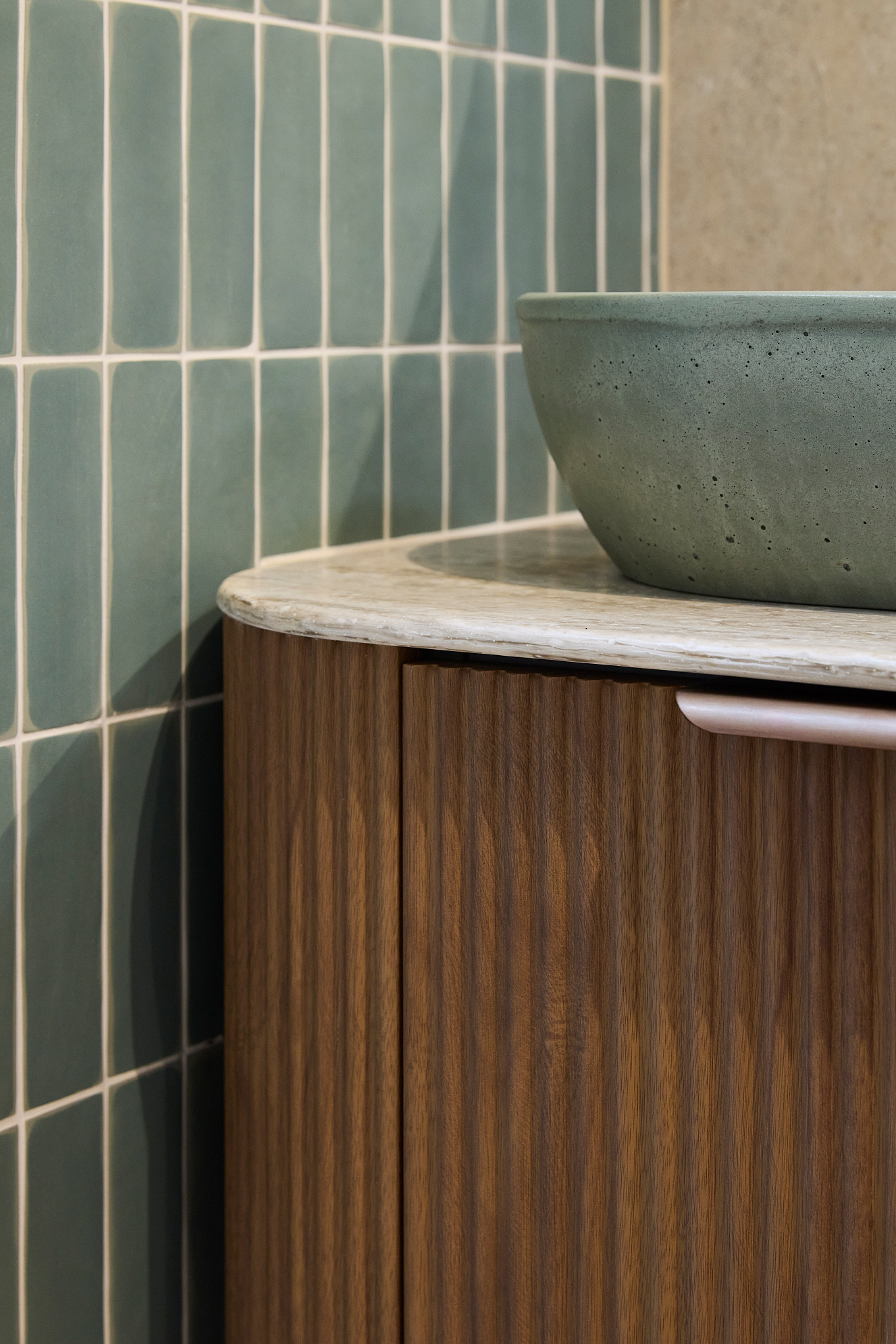 Texture plays a leading role in this space, with every detail chosen to add tactile interest and depth. The Milli Etch tapware and Marq Edit shower and accessories are standouts, featuring knurled detailing that invites touch and elevates the everyday experience. These textural touches, paired with the Kado Neue Fluted vanity in a walnut timber finish, bring warmth and character to the bathroom. The vanity’s bullnose edge, fluted profile, and curved form offer a contemporary nod to classic design while contributing to the room’s sense of softness and sophistication.