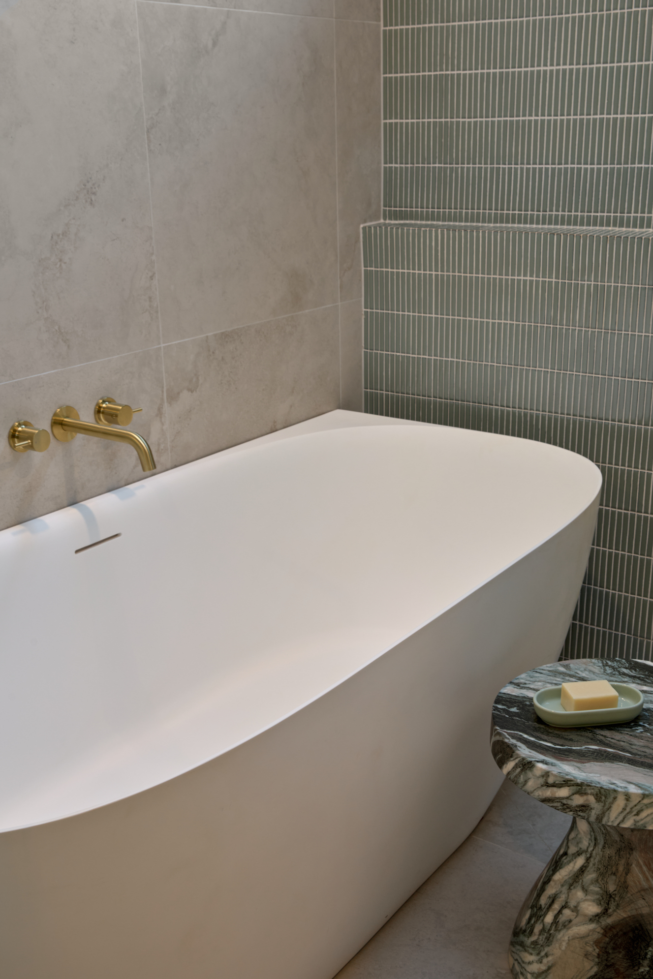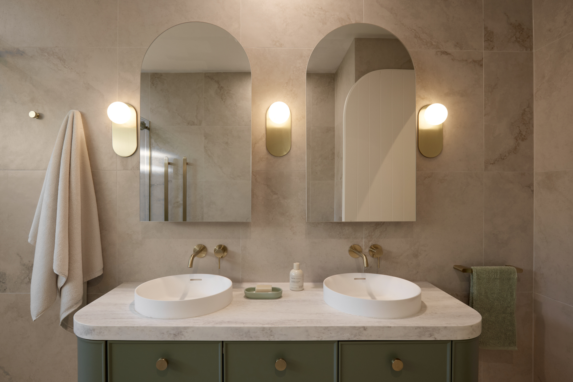 A standout feature of the bathroom is its commitment to soft curves and flowing lines. The Kado Era vanity, with its rounded corners, works in perfect harmony with the Kado Neue Arch mirror. These two pieces mirror each other’s gentle curves, creating a visual rhythm that promotes relaxation. The effect is further amplified by the inclusion of Mizu Drift curved tapware, which eliminates any sharp angles or harsh lines. This consistent design language reinforces the bathroom’s spa-like feel, making it a place of retreat and rejuvenation.
