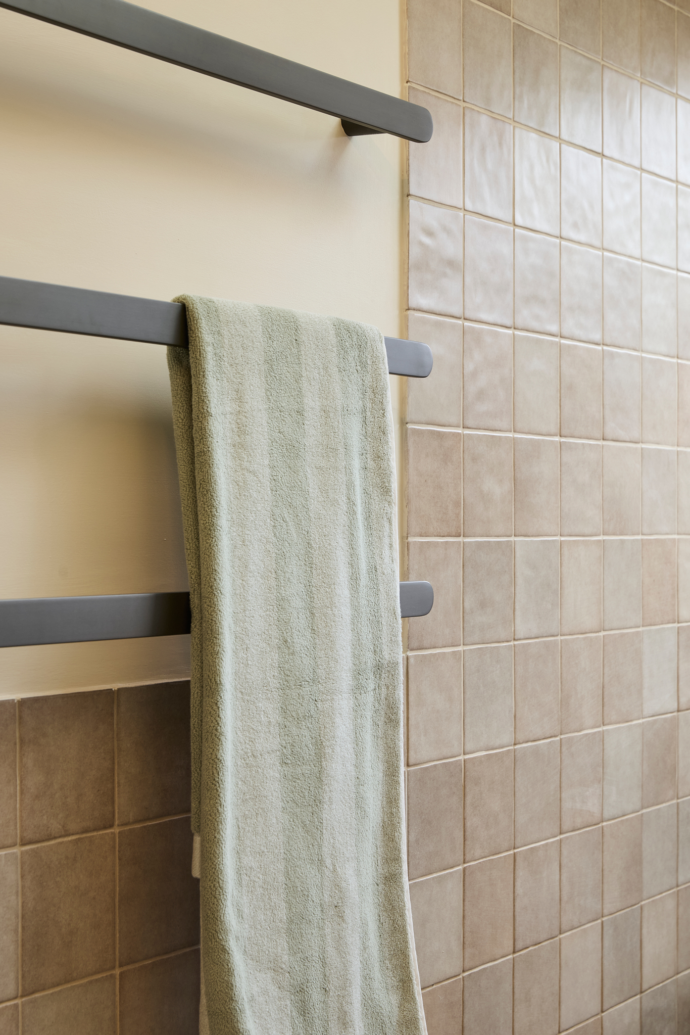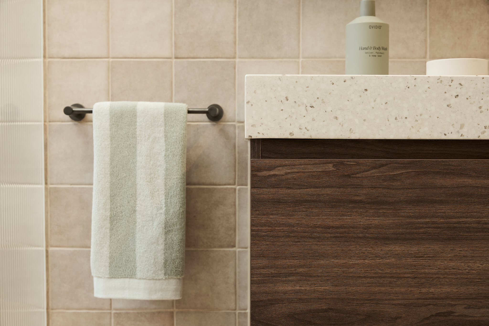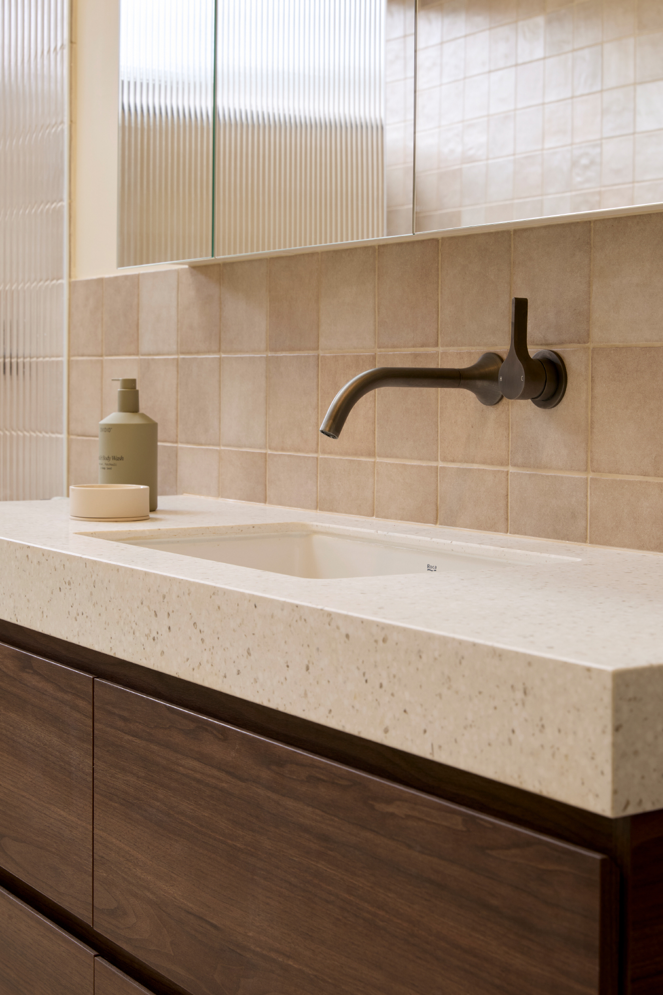 Robby and Mat have paired the vanity with the Kado Neue Mirror and Kado Lux Fluted Shower Screen, both of which introduce elegant curves and soft edges into the space. These rounded forms contrast beautifully with the solid lines of the vanity, bringing visual softness and a sense of flow to the overall design. The result is a bathroom that feels calm and cohesive - an inviting place to start or end your day.