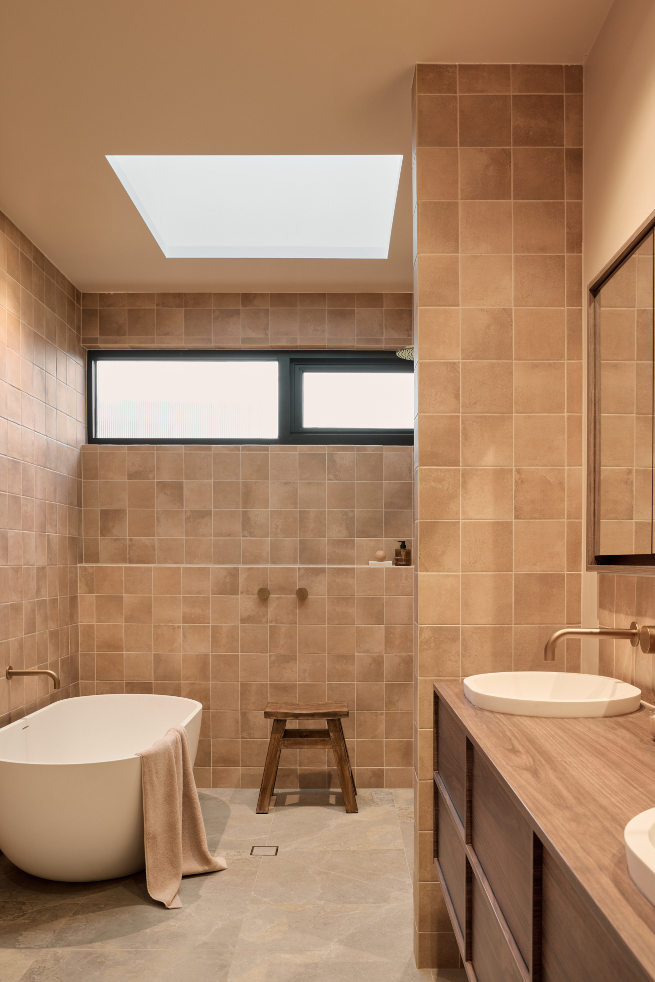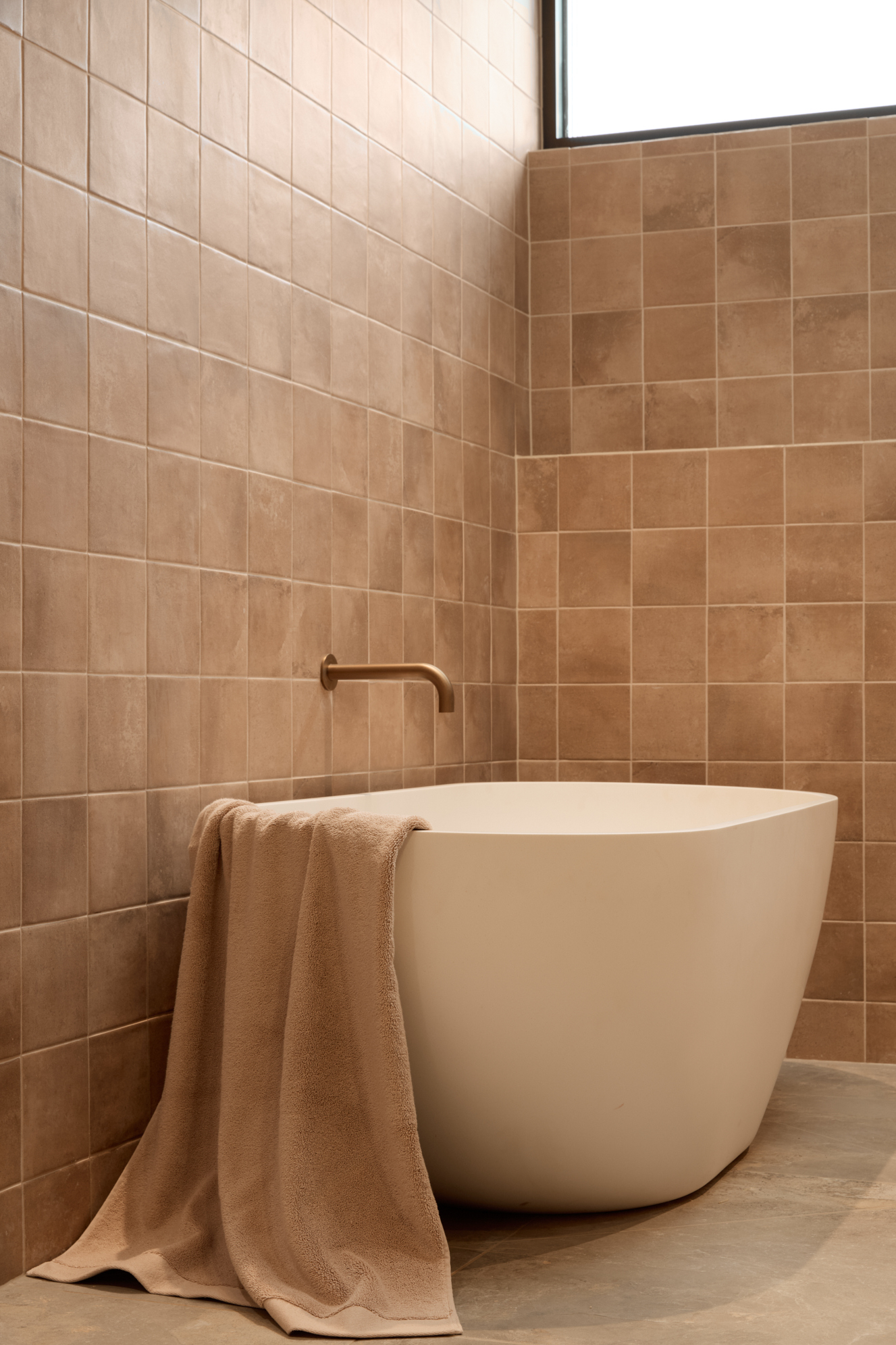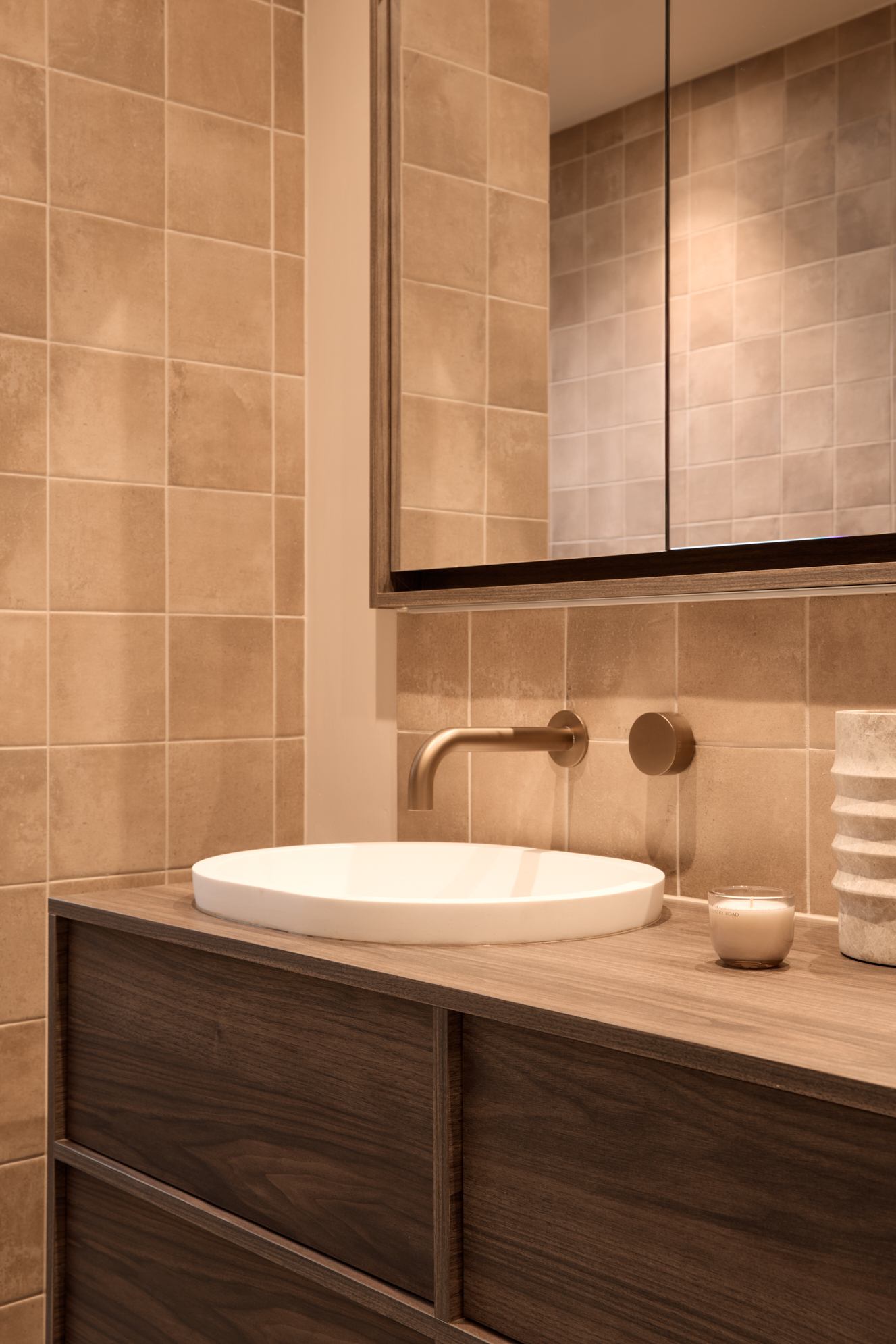 The inclusion of Milli Pure tapware, shower and accessories in bronze throughout not only elevates the design but also provides smart functionality. Made in Melbourne, these fixtures feature progressive mixer technology, giving users control over temperature and flow through a sleek single-dial mechanism - perfect for achieving a clean, minimalist look.