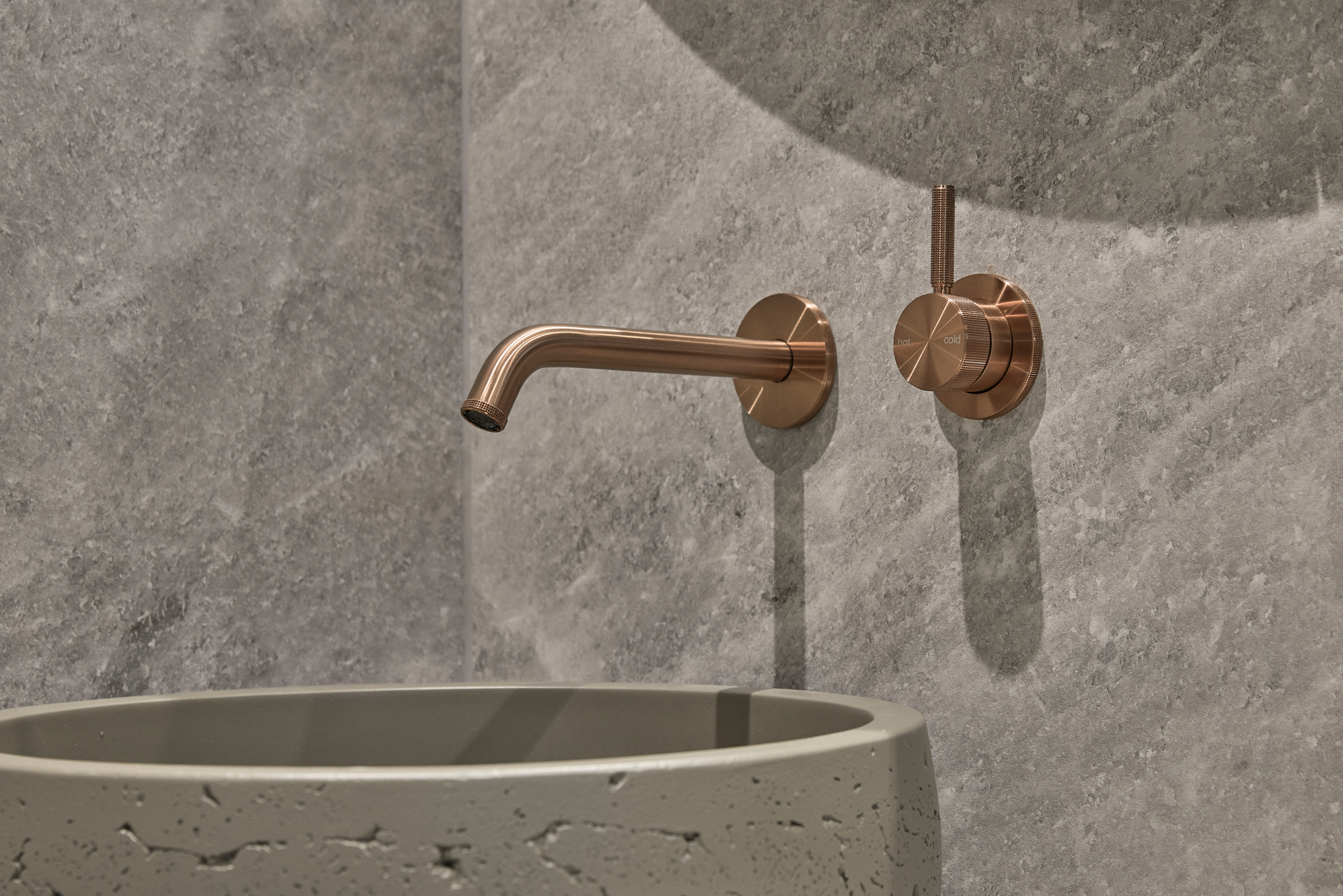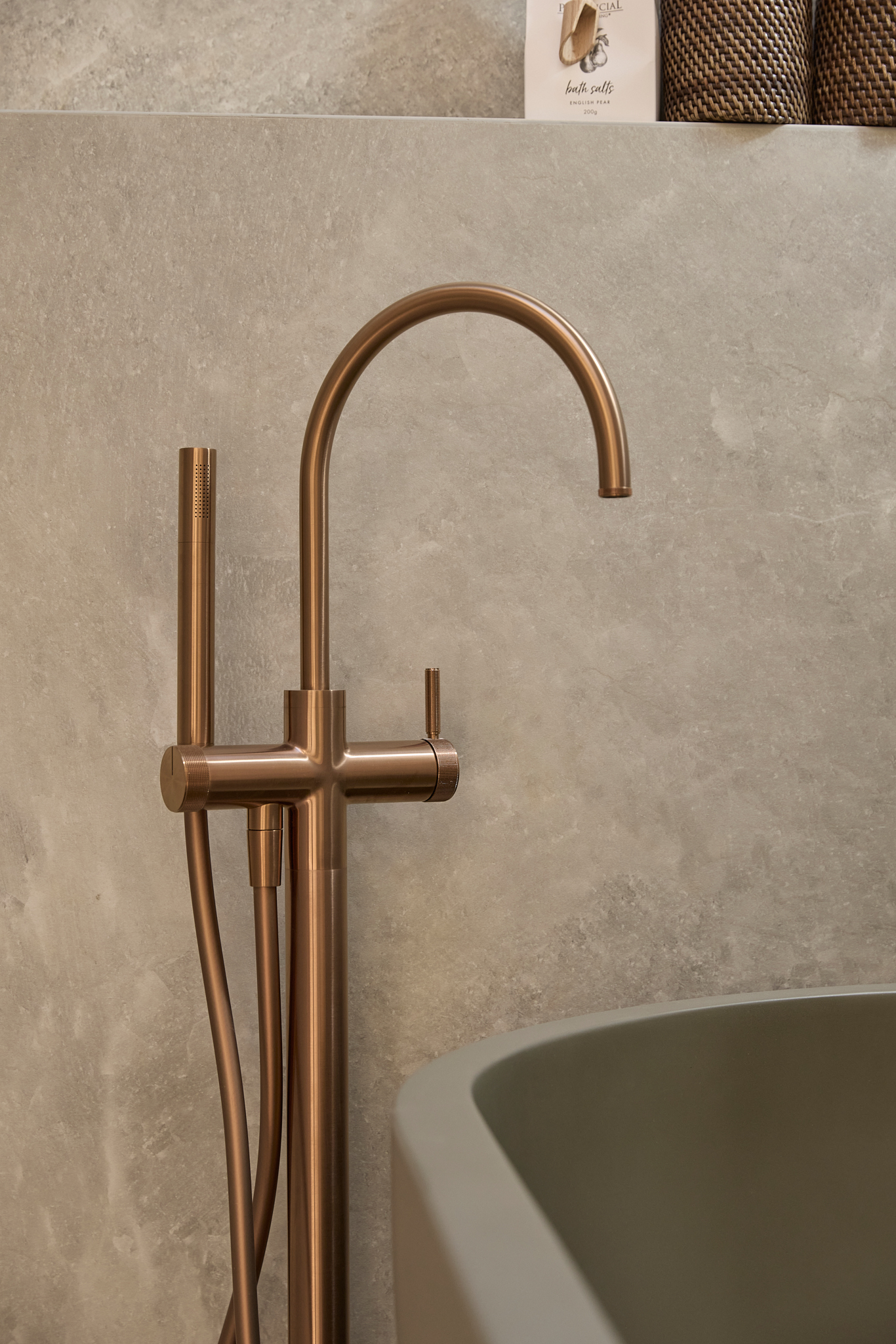 But let’s talk tapware, because this is where the luxury really kicks in. The Milli Etch tapware and Milli Marq showers are the true stars of this show. In a stunning brushed bronze finish with knurled detailing, these pieces scream indulgence (but in a very classy, inside-voice kind of way). The bath mixer with hand shower in particular is the kind of feature that makes you consider a long soak part of your wellness routine.