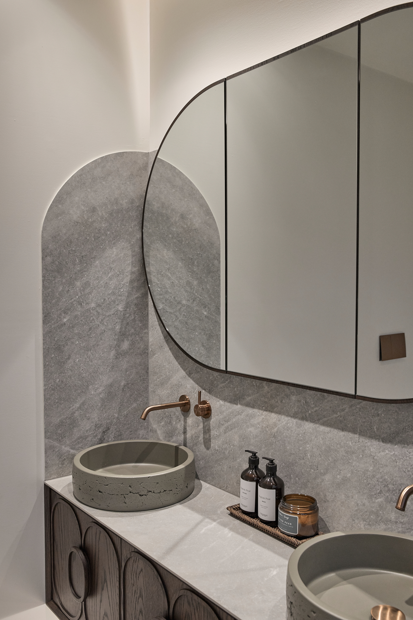 Rounding out the space are the small-but-mighty finishing touches. The ISSY Halo shaving cabinet, perfectly echoing the vanity’s oval motif, is more than just practical storage, it’s design harmony in action. When the forms and finishes work this seamlessly, it’s the kind of space that feels curated down to the last detail.