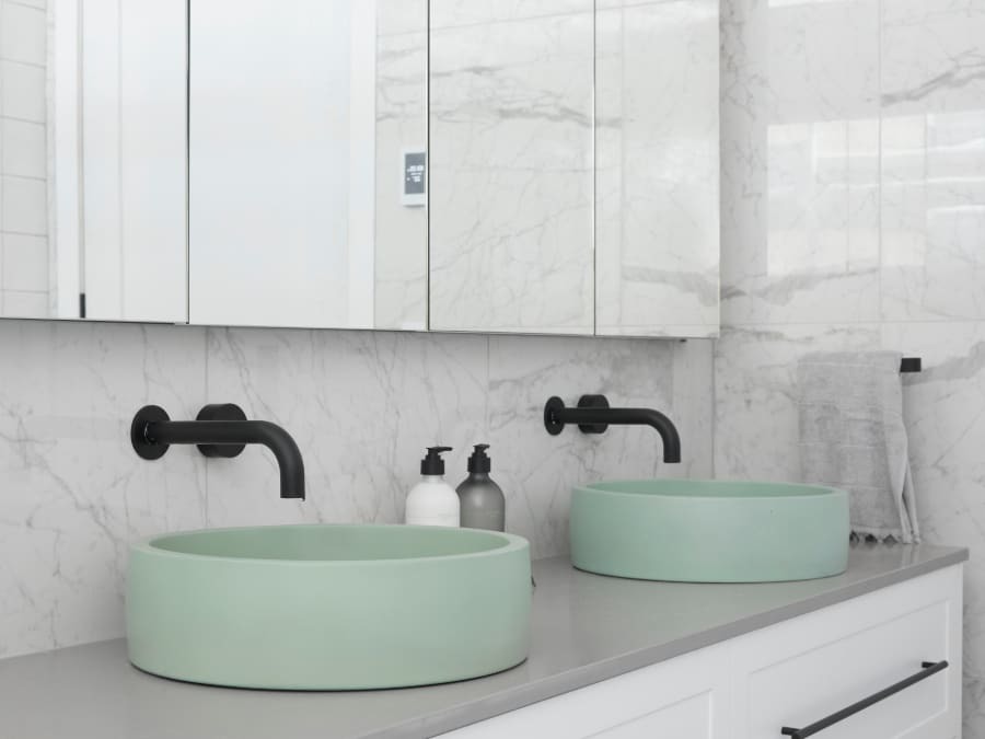 Daniel & Jade’s upstairs bathroom is a more playful interpretation of their previous room design. The mint green basins in the guest bathroom, teamed with the dramatic black starry night sky wallpaper in bedroom 3, fit the brief for an uber-cool teenage retreat on the second floor.