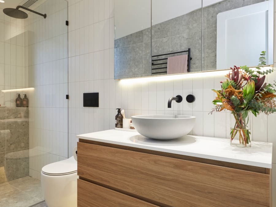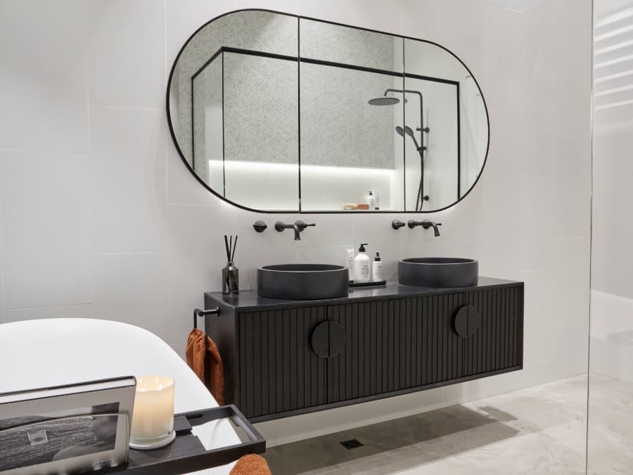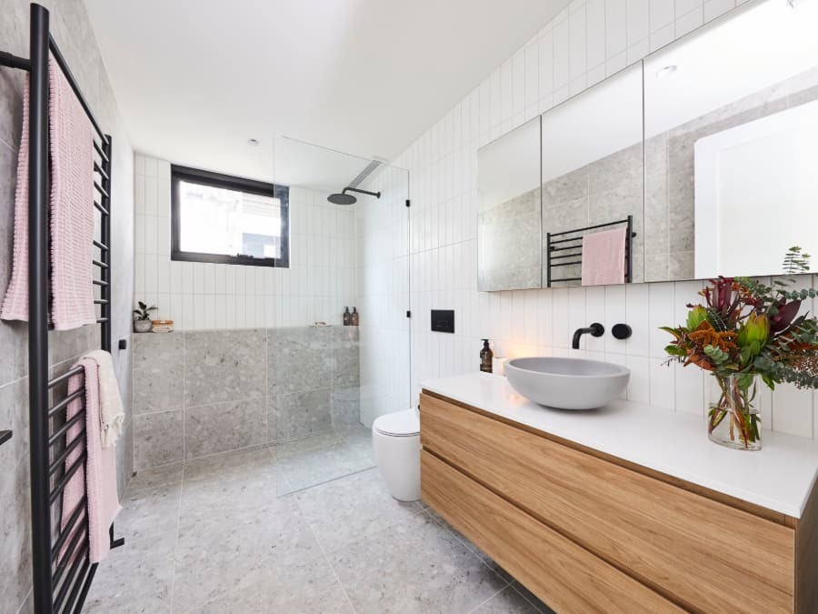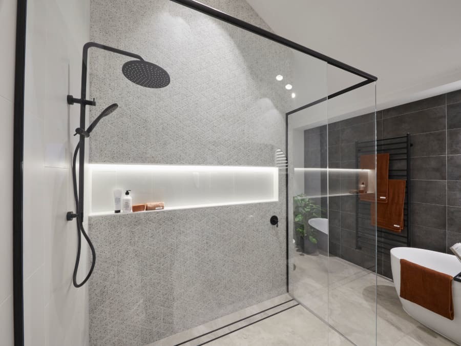 They have warmed up a grey and white scheme with the inclusion of a Posh Domaine Plus wall hung twin vanity. We really love the nib wall in the shower for its functionality in a family bathroom that will need to cater to multiple users, all needing space and storage for their products.