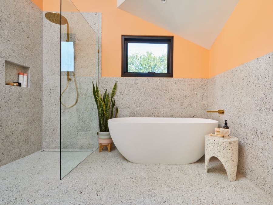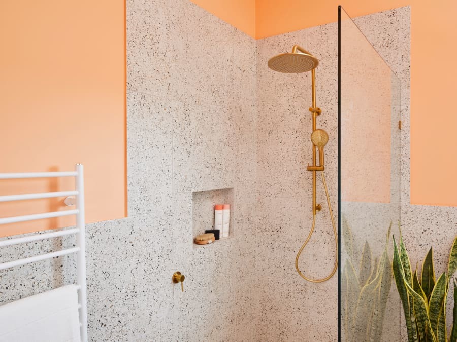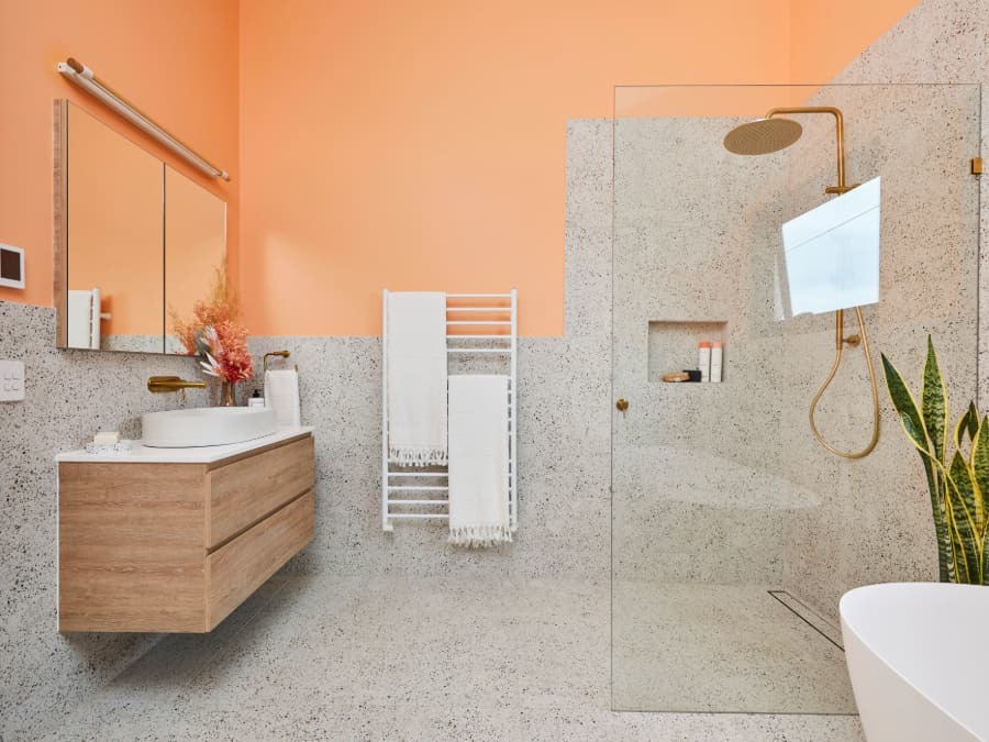 Jimmy & Tam have continued with their colourful and adventurous 50s design journey, producing yet another vibrant space. The peach colour on the walls adds a sorbet pop to this funky and family friendly bathroom, with the terrazzo tile is the major design feature in this room and a continued theme throughout their home.