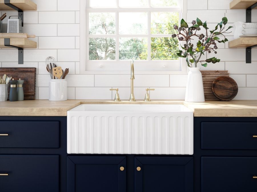 If classic design is more your style, the reversible farmhouse fireclay Harper sink features ribbed detailing on one side and a flat surface of the other, letting you choose the look that fits your home. Ideal for those seeking a true Hamptons aesthetic.