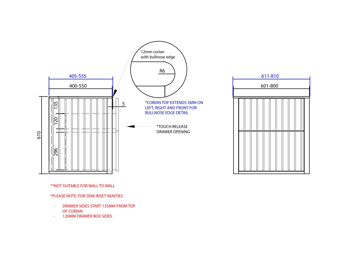 ISSY Custom Cloud II 601-800mm x 400-550mm x 610mm Wall Hung Vanity Unit 2 Touch Latch Drawers Semi Inset (No Basin)
