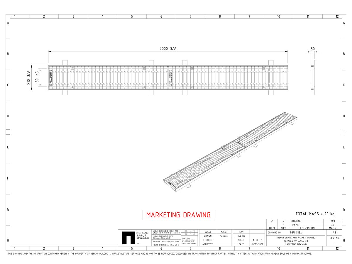 GMS Boltdown Trench Grate & Frame Class B Clear Opening 150mm x 2mtr