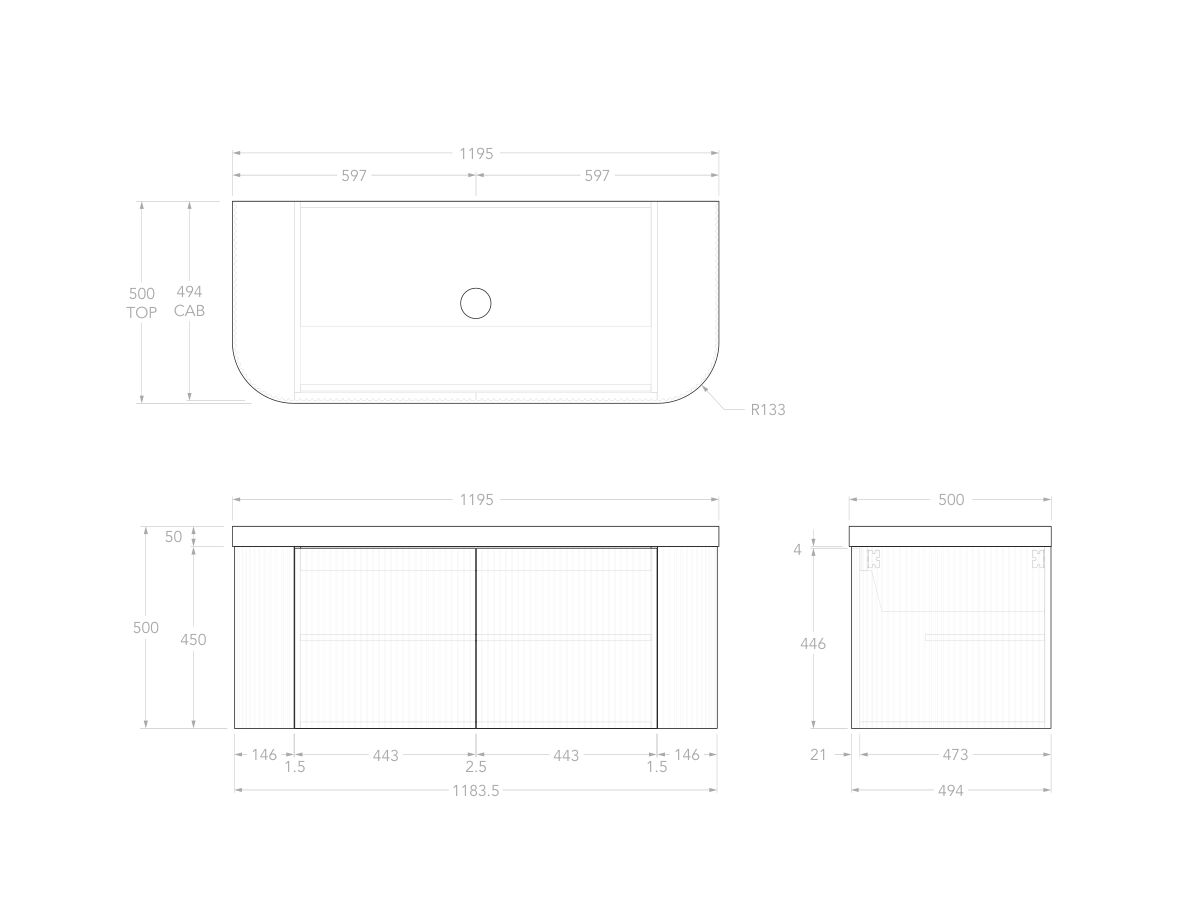 Kado Neue Fluted Double Curve All Door 1200mm Wall Hung Vanity Centre Basin 50mm Durasein Top