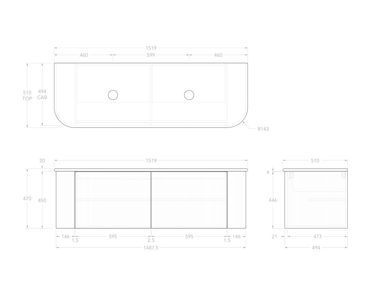 Kado Neue Fluted Double Curve All Door 1500mm Wall Hung Vanity Double Basin 20mm Cherry Pie Top