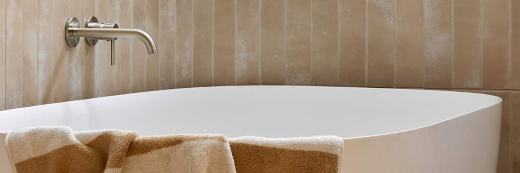 Discover Britt and Taz’s calming wellness sanctuary, where muted tones, a deep bath, and a feature shower invite pure relaxation.