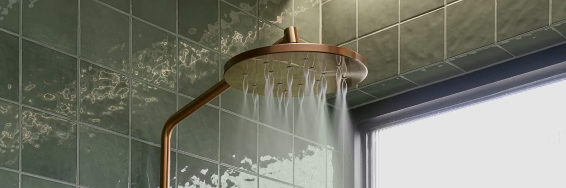 Emma and Ben’s Guest Suite blends calming moss-green tones, cohesive bronze detailing, and the showstopping Milli Marq Shower for an experience guests won’t want to leave.